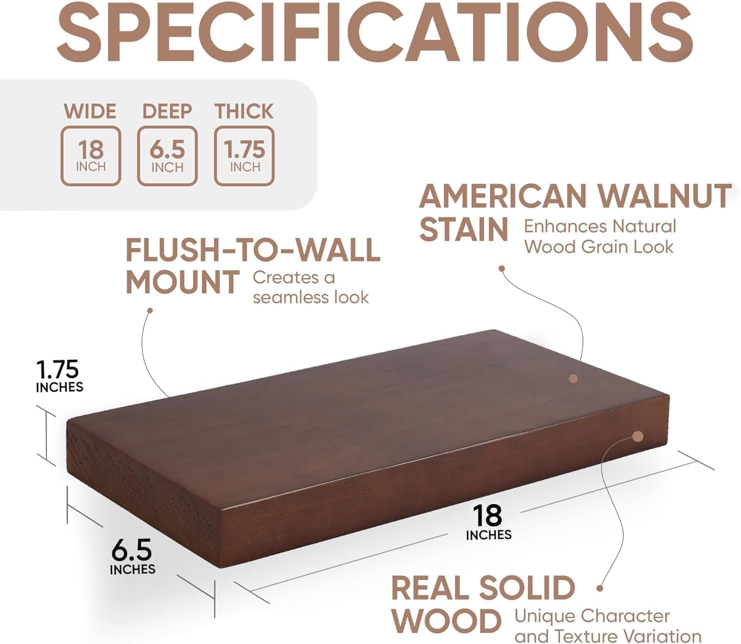 - AUTHENTIC WOOD GRAIN - Enjoy the timeless elegance of real wood. Handcrafted from the finest 1.75" Thick natural pine wood measuring 18" Wide x 6.5" Deep x 1.75". Our shelves highlight the inherent charm and durability of high-quality wood. Each Shelf reveals its unique character of knots and natural wood grain; each ledge is a little different but equally stunning.