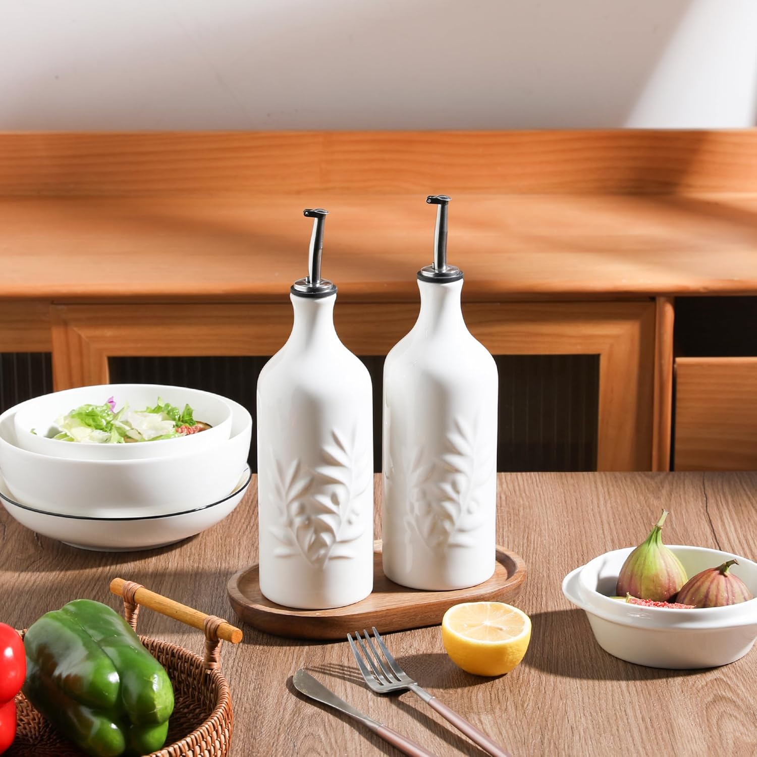 Sweejar Ceramic Olive Oil Dispenser Bottle, 20 Oz Relief Opaque Oil Cruet Protects To Reduce Oxidation, Suitable for Storage,Vinegar, Soy Sauce,Liquids,Set of 2 (White White)