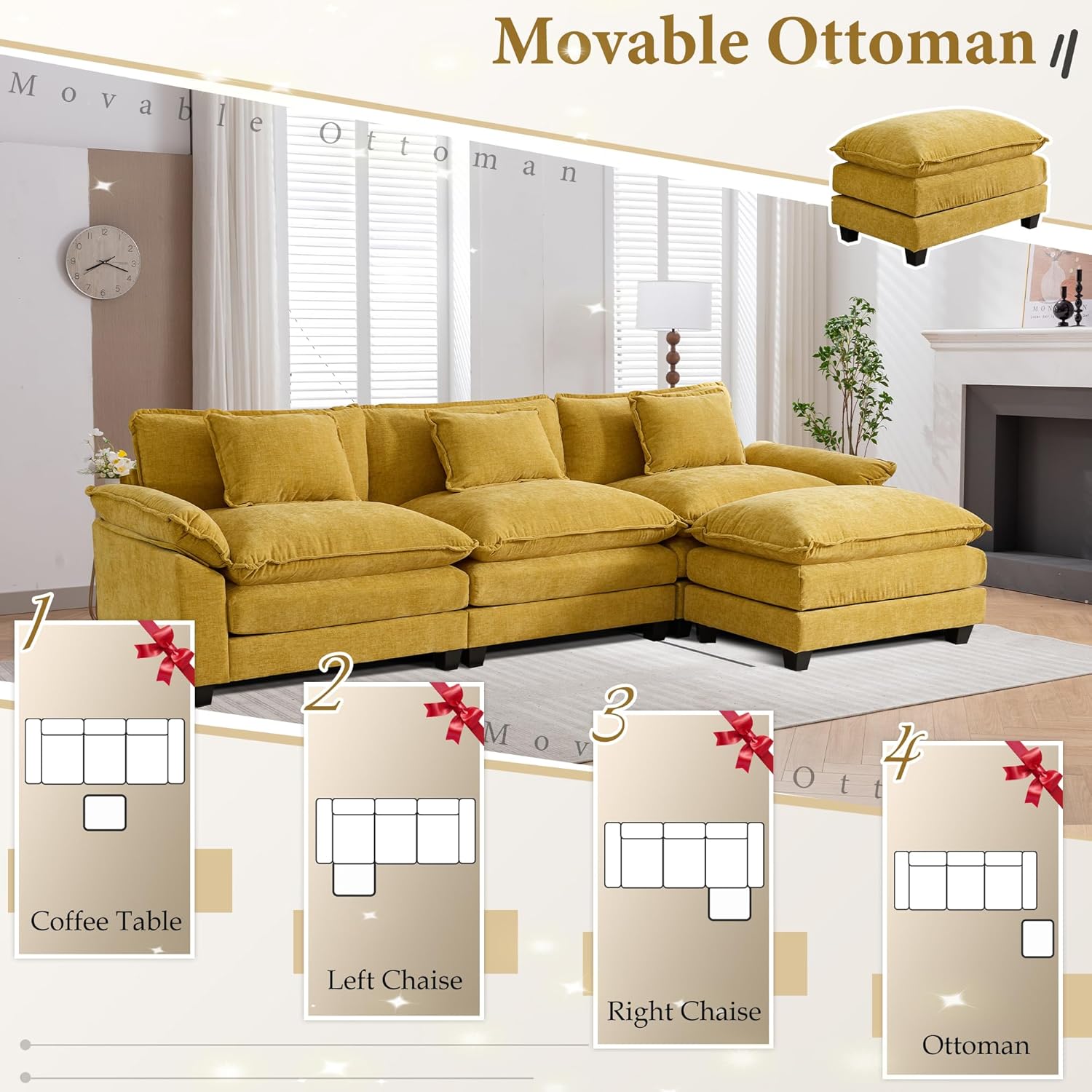 URRED Modular Sectional Sofa Comfy Cloud Couch, Modern Chenille Sofa Sleeper Deep Seat Couches with Ottoman/Pillows for Living Room (Yellow, 117''- L Shape)