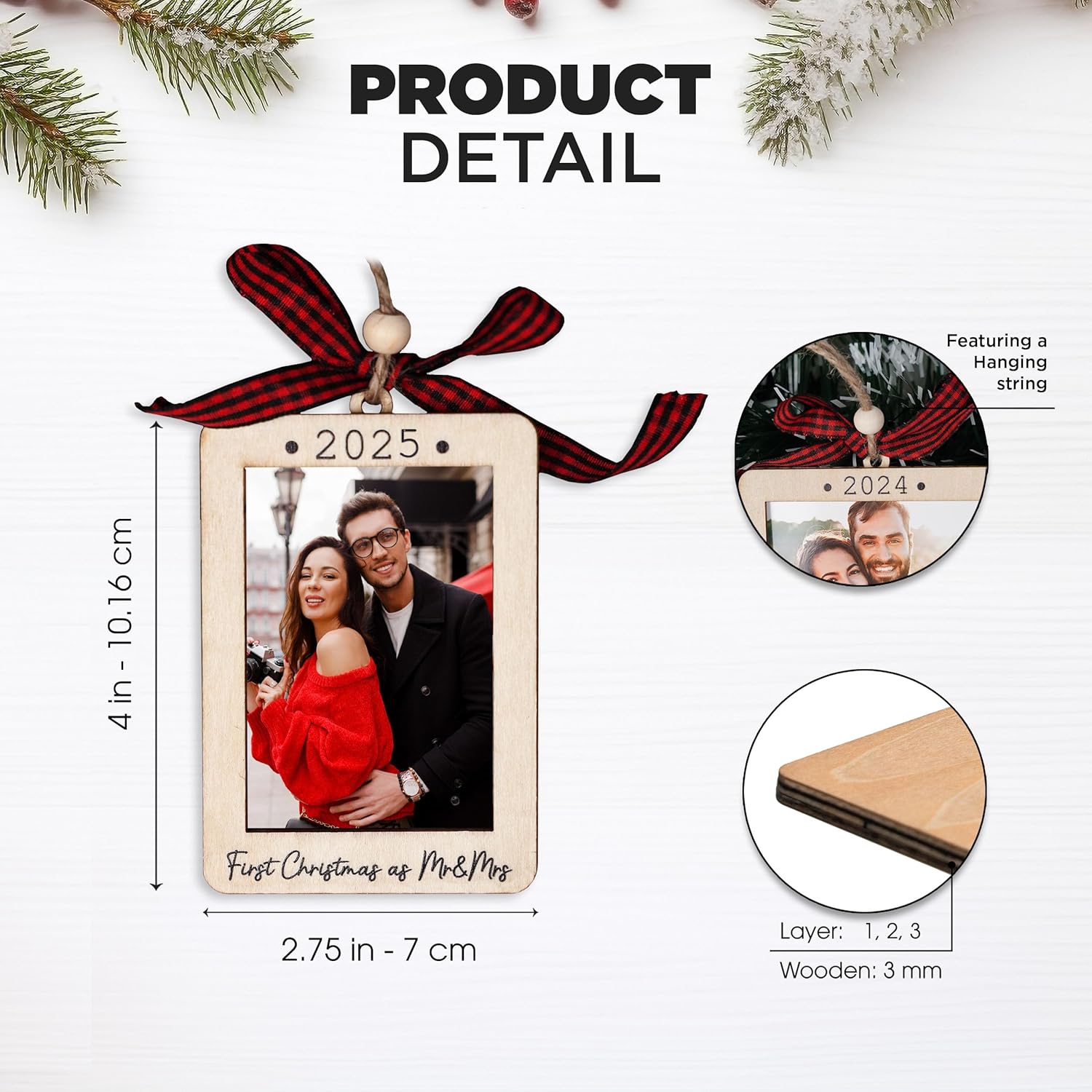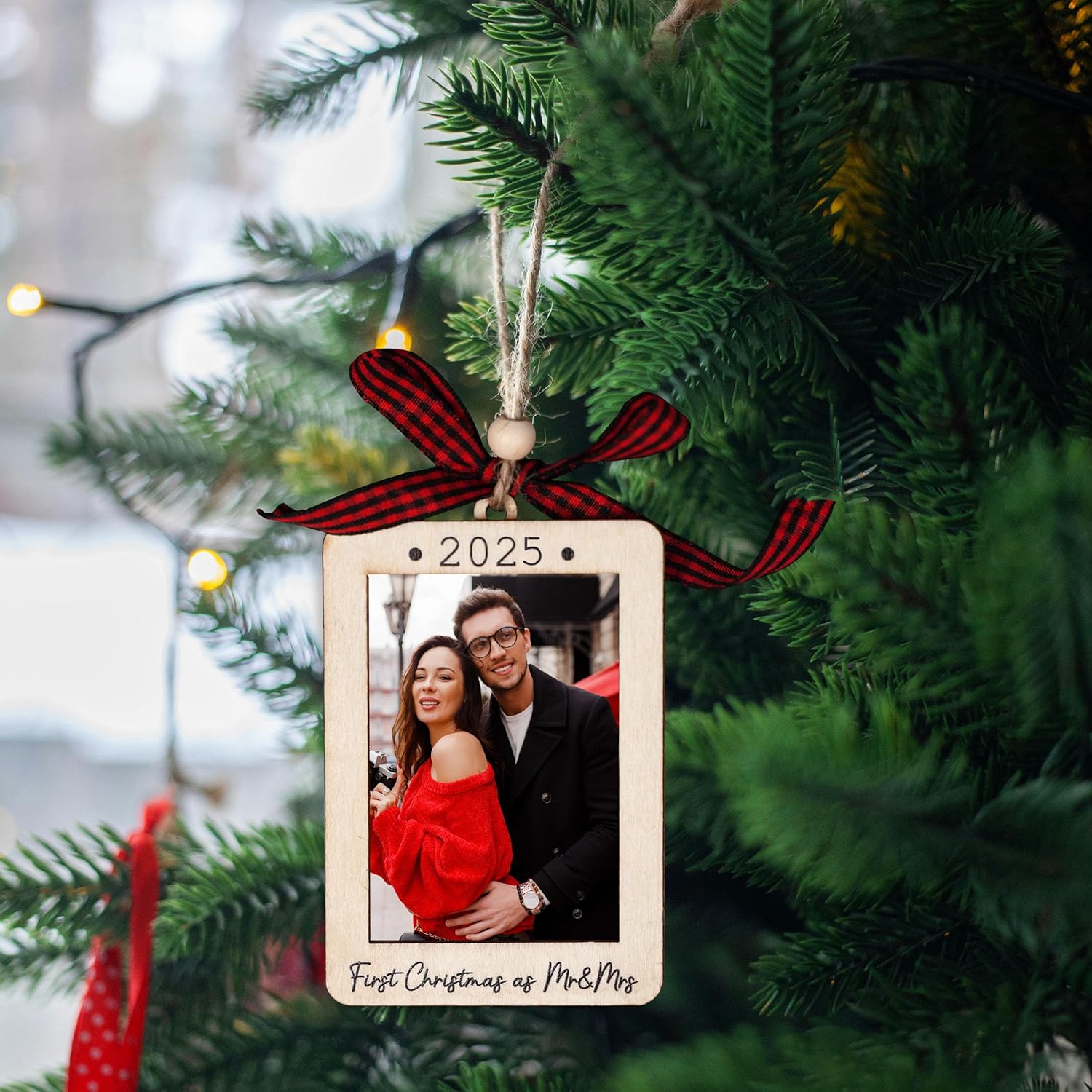 Christmas Photo Frame Ornament, 2025 Ornament, Wooden Picture Frame Ornaments With Hanging String (2025 Mr & Mrs (Portrait))
