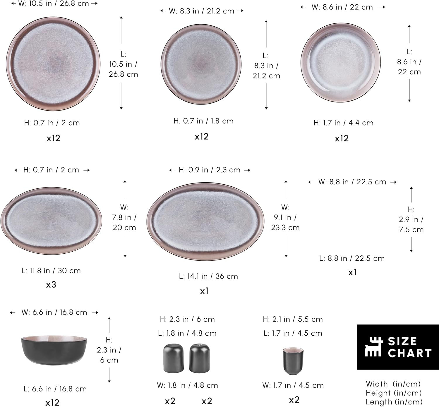 - Complete Set for 12: This plate set contains 12 dinner plates (26.8cm, 10.5β), 12 dessert plates (21.2cm, 8.3β), 1 salad bowl (22.5cm / 8.8"), 12 pasta bowls (22cm / 8.6"), 12 cereal/soup bowls (16.8cm, 6.6β), 3 small serving platters (30cm / 11.8") and 1 large serving platter (36cm / 14.1"), 2 salt and pepper shaker and 2 toothpick holders. Designed to be used by 12 diners and ideal for family gatherings and special occasions.