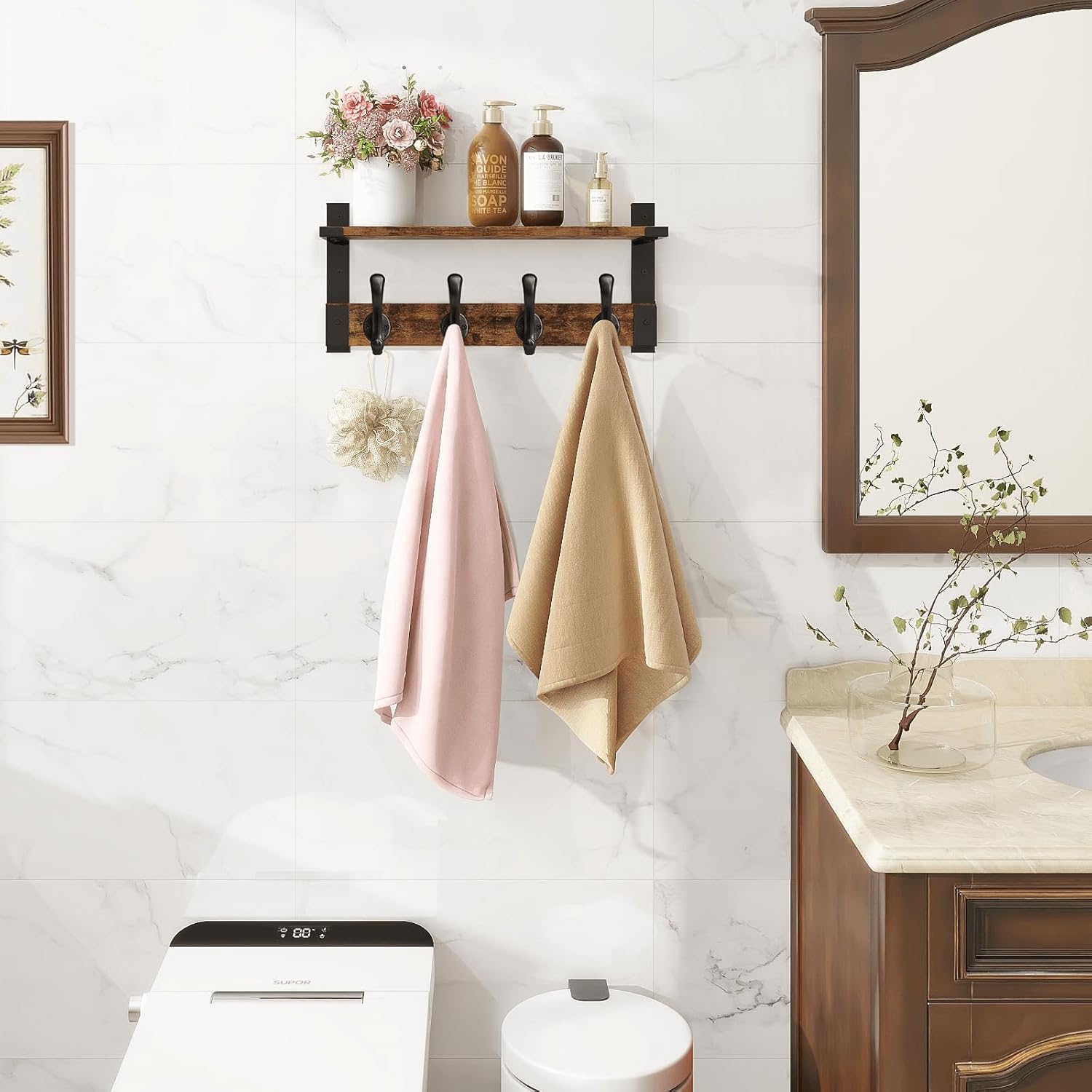 Homode Coat Rack Wall Mount with Shelf, Wood Wall Hooks with Shelf, Heavy Duty Entryway Shelf with Hooks with 4 Metal Hangers for Hanging Key Towel Hat Purse, Bathroom Bedroom, Rustic Brown Black