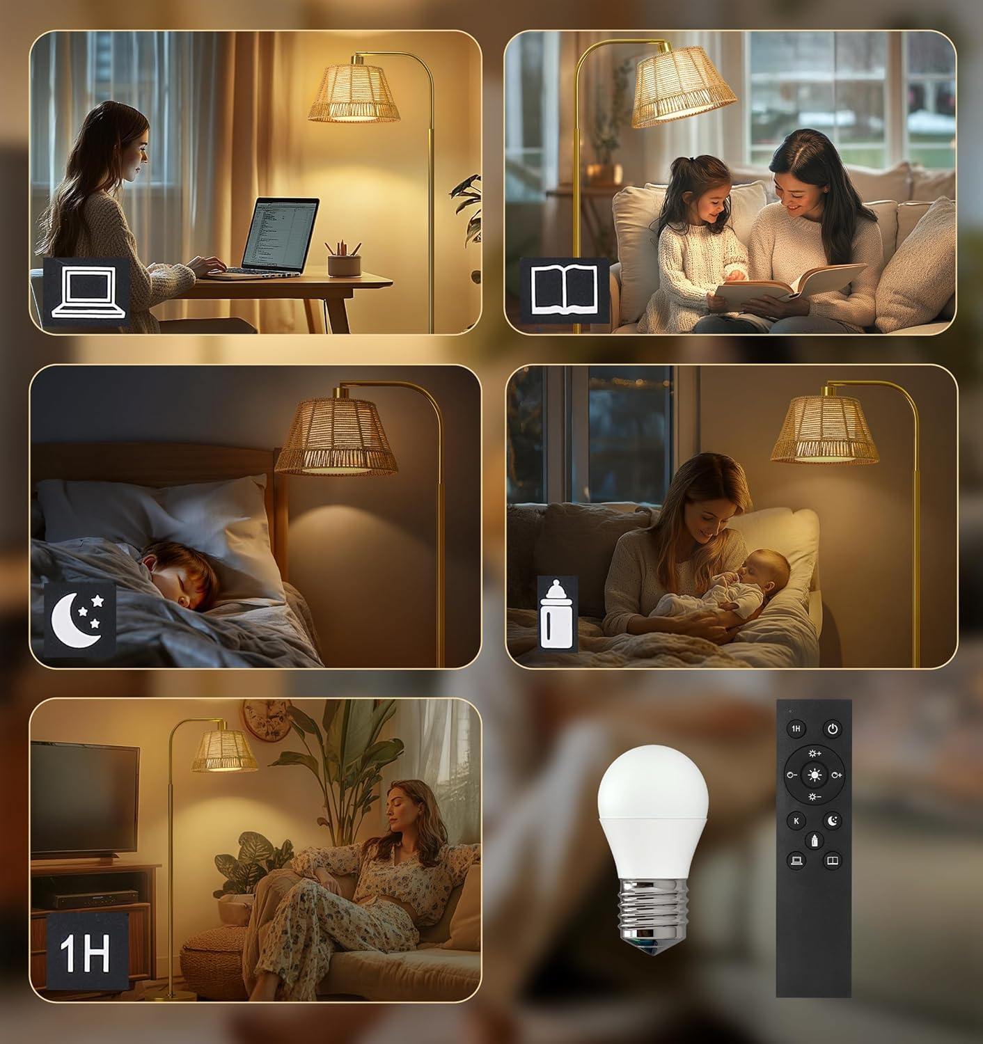 - 【Stepless Dimmable & 3 Color Temperatures】Saving your time to look for compatible bulbs, Our rattan floor lamp comes with an E26 smart bulb, which supports stepless brightness (1%-100%) and 3 color temperatures (3000K-6000K)and timer settings(1hour)as needed, This dimmable floor lamp also have pre-set modes offering various scenes such as: read, nursery, work and night light.The memory function can help you remember the last setting.