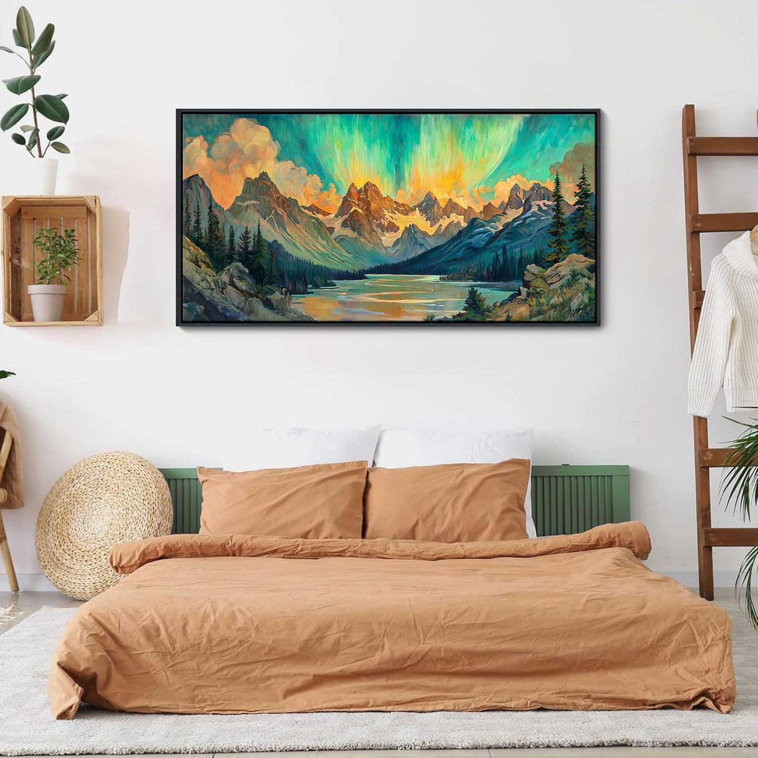 JEAWA Framed Canvas Wall Art - 24x48 In Large Abstract Painting Decor, Textured Mountain Lake Tree Aurora Polaris Pictures, Modern Art Prints for Bedroom Living Room Bathroom Home Decoration