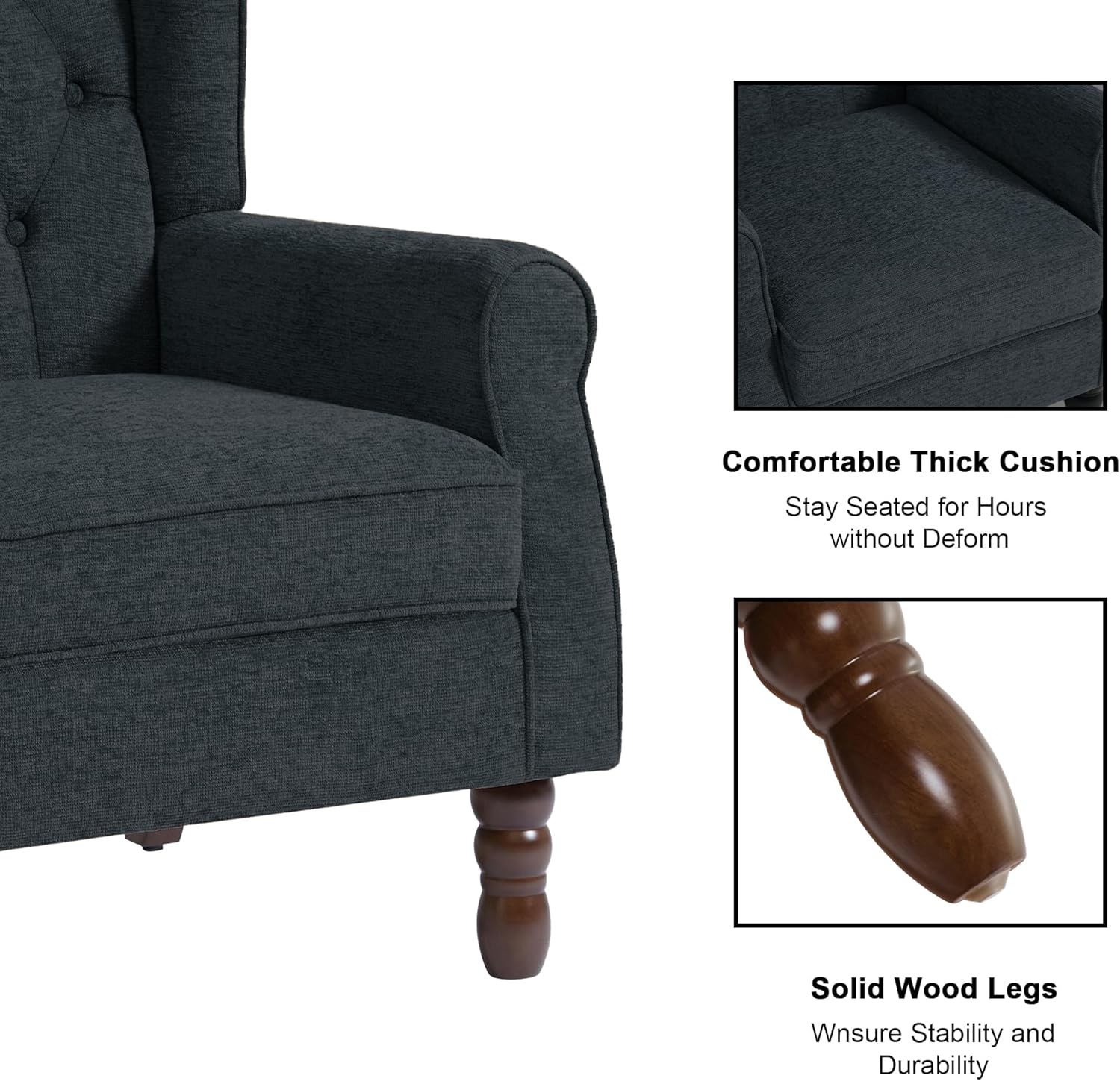 - Comfy and Robust Build Reading Chair: Our comfy bedroom chair with solid wood frame construction can easily support the weight of 400 Lbs. And the cushion and back of this sofa chair is made of high-density and high-elasticity foam, which can provide you with maximum comfort