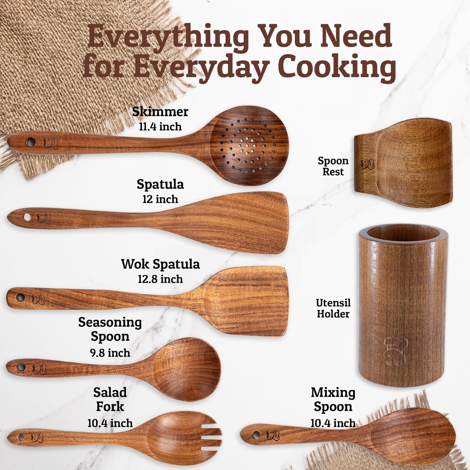 - Built Tough, Made to Look Good - Durable enough for daily meals, good-looking enough for guests. This teak wooden kitchen utensils set holds up to heat, moisture, and constant use - while still looking clean and classic every time you grab it.