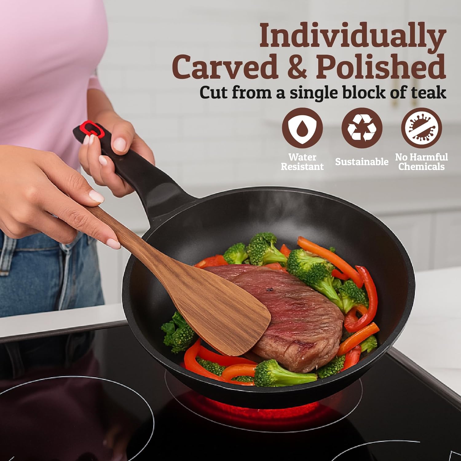 - Individually Carved from a Single Piece of Premium Teak - Each utensil is carved from one solid block of responsibly sourced teak - no joints, glue, or fillers. After shaping, it’s hand-polished to a smooth, contoured finish that highlights the natural grain and feels great in your hand. Sealed with a food-safe, water-based resin to help resist wear and moisture, this is a set built for beauty, comfort, and everyday kitchen use.