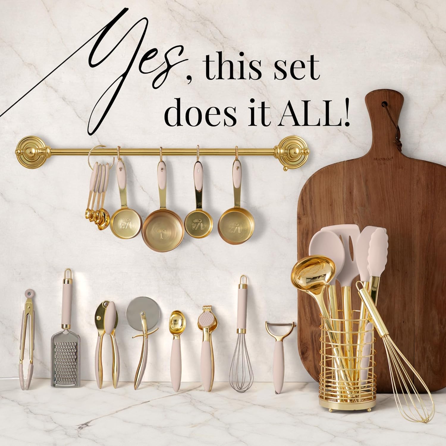 - 23 GOLD KITCHEN TOOLS, PERFECTLY COORDINATED: This complete 23-piece gold cooking utensils set includes a gold whisk, gold ladle, gold spatula, silicone slotted spatula, gold spoon, tongs, garlic press, cheese grater, gold can opener, gold pizza cutter, gold ice cream scoop, mini gold tongs and whisk, gold utensil holder, and a full gold measuring cups and spoons set. Your beige kitchen accessories have never looked so luxurious—or complete.