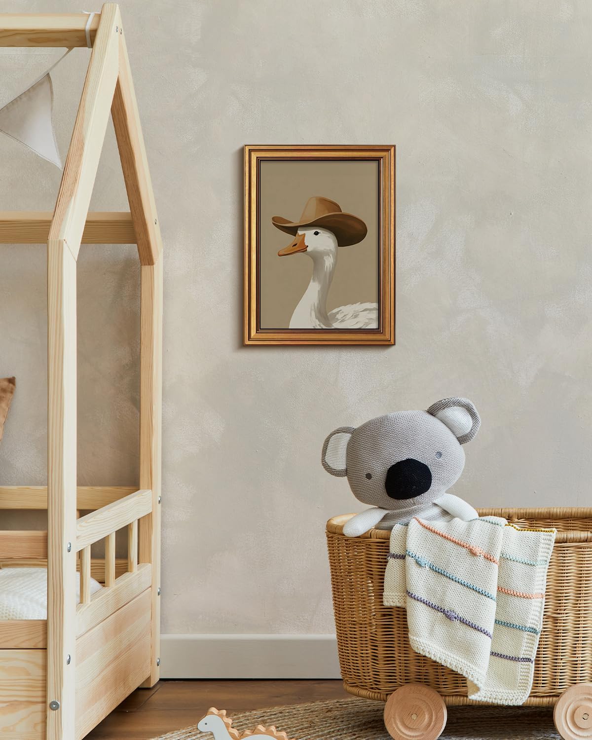 - FUNNY & UNIQUE DESIGN: This whimsical artwork wall art print portrays a white duck wearing a cowboy hat, exuding a unique personality and playful charm, Reminiscent of a Western cowboy. The warm earthy tones, combined with a vintage gold frame, make this an ideal piece for living rooms, offices, or farmhouse. More than just a painting, it’s a statement of humor and individuality, perfect for those who appreciate lighthearted and quirky home décor