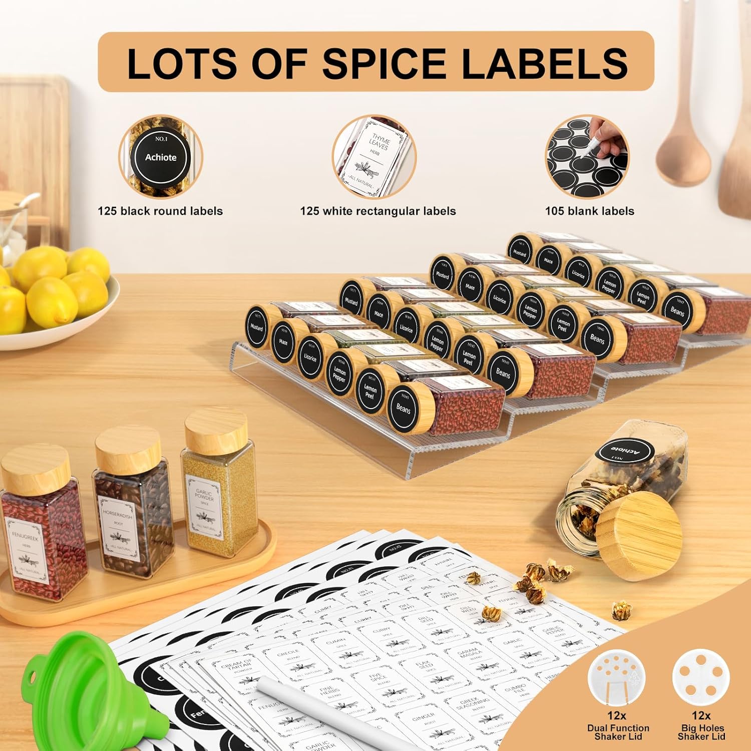 - CUSTOM SPICE STORAGE ORGANIZATION: Transform your kitchen decor with our 4-pack acrylic spice racks featuring 2-tier designs that hold 24 bamboo-lidded glass spice jars. Complete with 355 labels, a funnel, and a white marker, this kitchen accessories system organizes 24 spices effortlessly. Perfect for drawers, countertops, or cabinets, the crystal-clear acrylic displays your collection while keeping kitchen essentials within reach