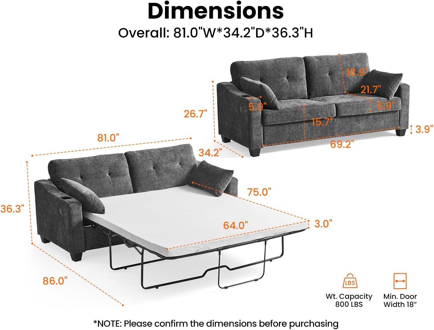 - Product Dimensions : 34.2"D x 81"W x 36.3"H