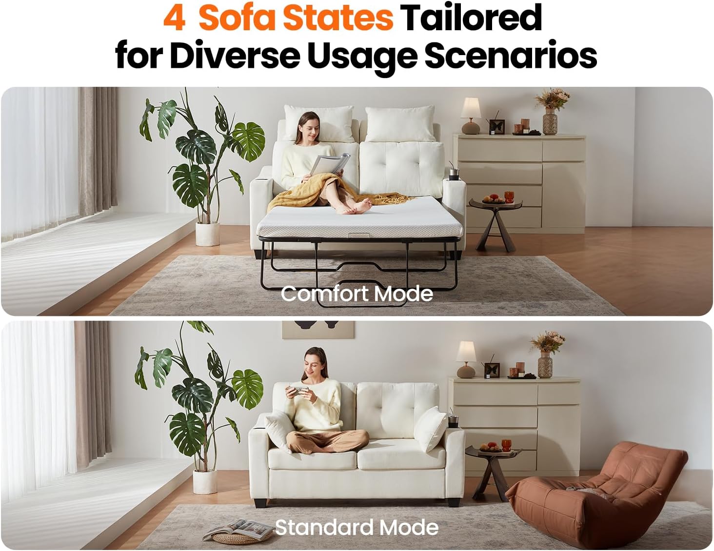 - ăVersatile 4-in-1 Sofa Modes for Every MomentăDesigned to adapt to your lifestyle, this sofa transforms effortlessly between four configurations: Standard Mode, Comfort Mode, Nightlight Mode, and Sleep Mode. Whether youâre working, relaxing, or hosting guests, enjoy a flexible seating solution that fits any scenario