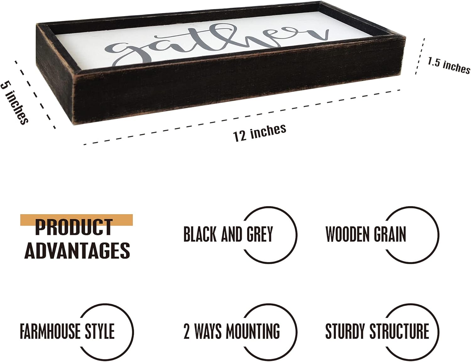Gather Sign for Home Decor in Grey - Farmhouse Kitchen Dining Room Wall Decor - Rustic Wall Decoration Solid Wood Thick Black Frame 12x5 Inches