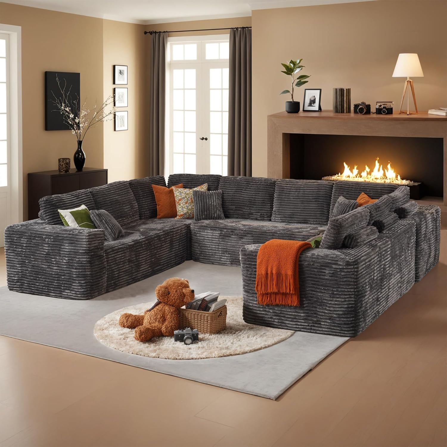 HOOOWOOO Cloud Sectional Couches for Living Room,Modular Sectional Sofa No Assembly,136X110 Inch Plush Corduroy Large U Shaped Floor Couch Set with Deep Seat(Gray)