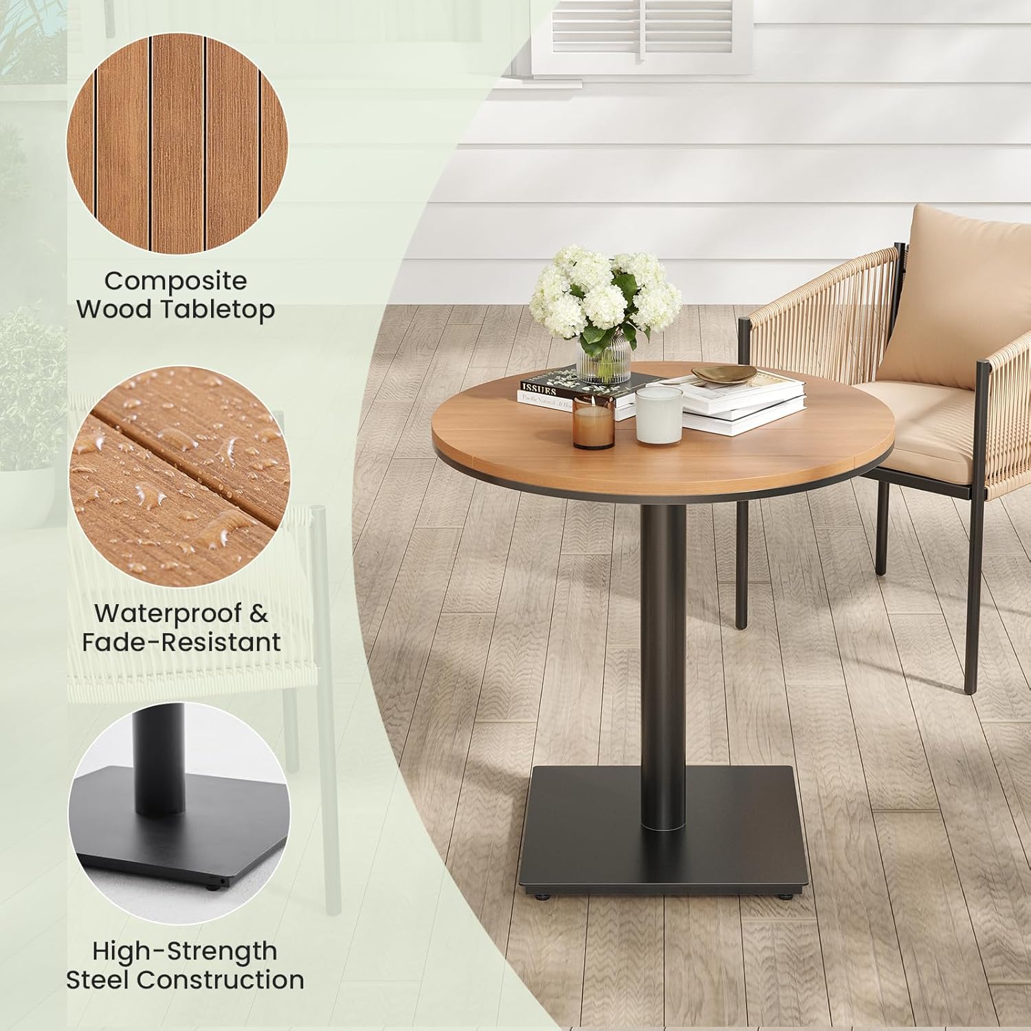 - [DURABLE & LOW-MAINTENANCE DESIGN]Crafted with a unique wood-like tabletop and a sturdy metal base, this outdoor table combines rustic charm with modern durability. The plastic-wood material resists rust, stains, and weather damage, making it perfect for year-round outdoor use. Spend less time on maintenance and more time enjoying your outdoor oasis.