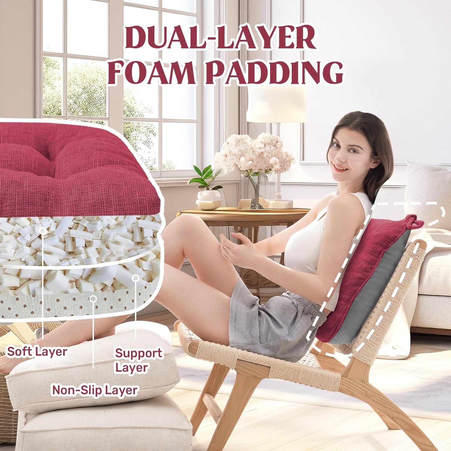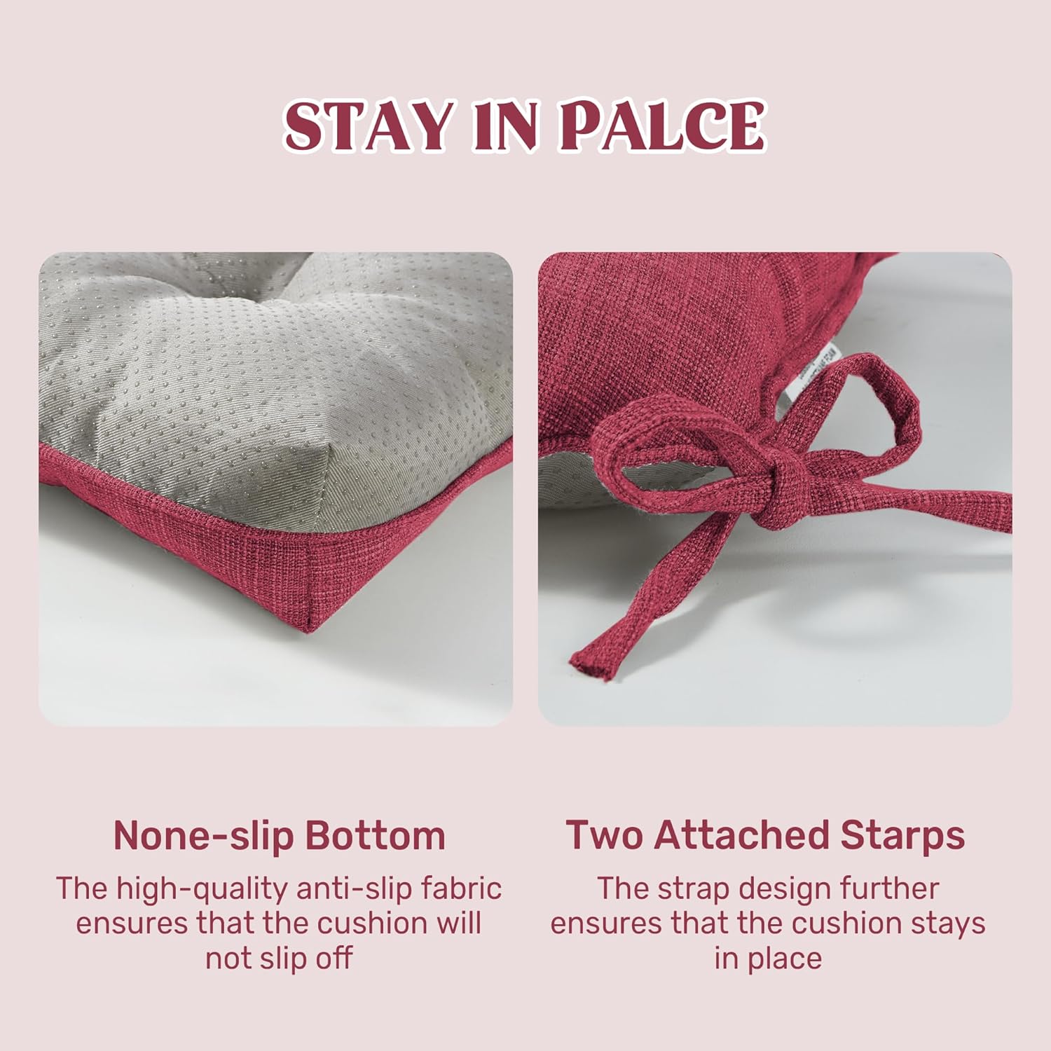 - Secure & Non-Slip Design: Featuring a non-slip bottom and adjustable straps, this cushion stays firmly in place on any chair, preventing unwanted slipping and shifting. The added security means you can enjoy a stable seating experience without constant adjustments. Plus, with multiple packs available, you can easily upgrade several chairs at once for a coordinated look.