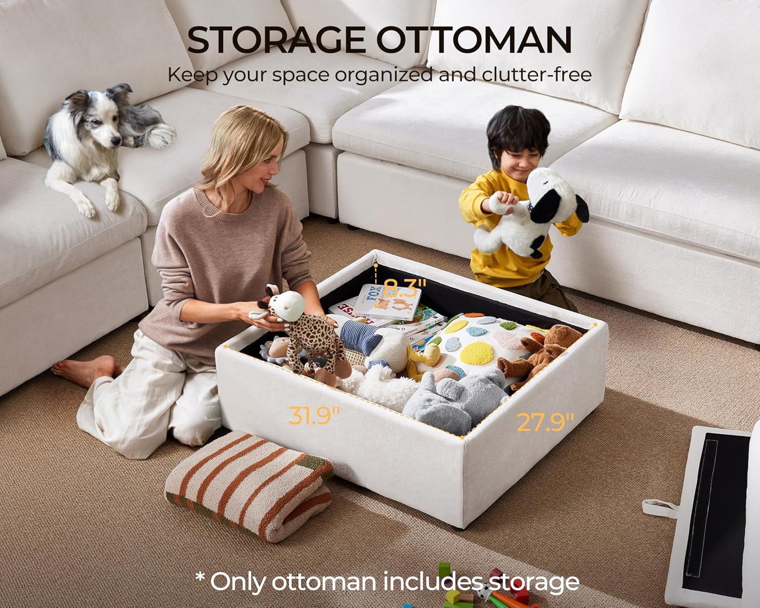 - ăOptional Hidden Storage for a Tidy Spaceă Maintain a clutter-free home with the optional storage ottoman module, designed to keep blankets, pillows, or toys neatly tucked away. Convertible Couch with storage ensures essentials are always within reach yet out of sight, adding both function and style to your oversized fluffy modular sofa. Note: Storage is only available in configurations with the ottoman module