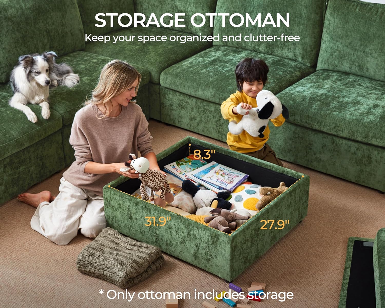 - ăOptional Hidden Storage for a Tidy Spaceă Maintain a clutter-free home with the optional storage ottoman module, designed to keep blankets, pillows, or toys neatly tucked away. Convertible Couch with storage ensures essentials are always within reach yet out of sight, adding both function and style to your oversized fluffy modular sofa. Note: Storage is only available in configurations with the ottoman module