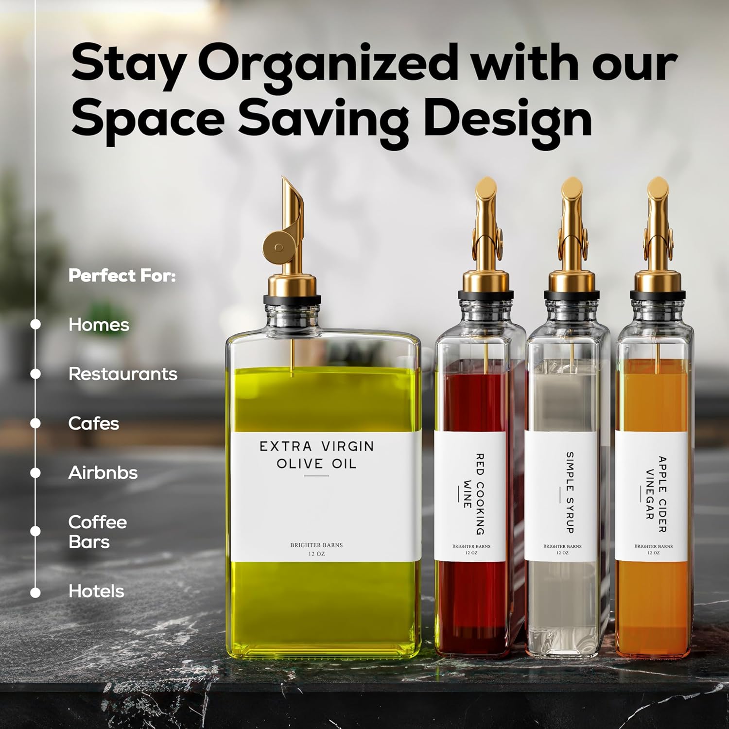 - ELEVATE YOUR SPACE & STAY ORGANIZED - Transform your kitchen with our elegant, space-saving glass oil bottles for kitchen. The sleek, minimalist design not only adds a touch of luxury but also keeps your kitchen organized with its slim, elegant profile. Tailored to blend seamlessly with any decor—from modern and luxury to farmhouse, minimalist, neutral or vintage, this is the kitchen decor upgrade your home, coffee bar, Airbnb, café, or restaurant has been waiting for.