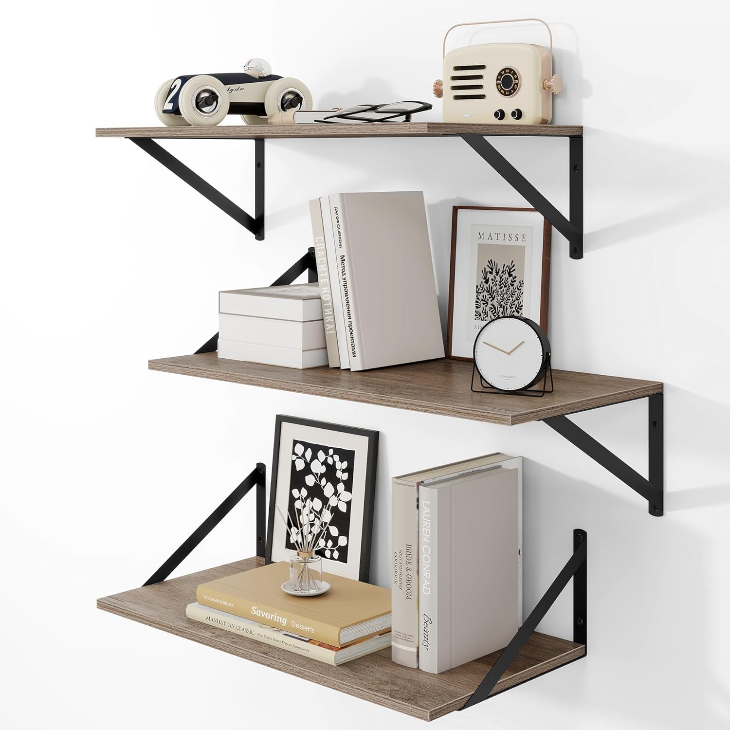 - Effortless 10-Minute Installation: All necessary hardware is included in the package. With pre-drilled mounting holes and detailed step-by-step instructions, these wide floating shelves can be securely installed in just minutes. Package Contents: 3 wooden boards (24" W x 12" D), 6 steel brackets, 13 anchors, 13 long screws, 13 short screws, 1 level, 1 installation manual.