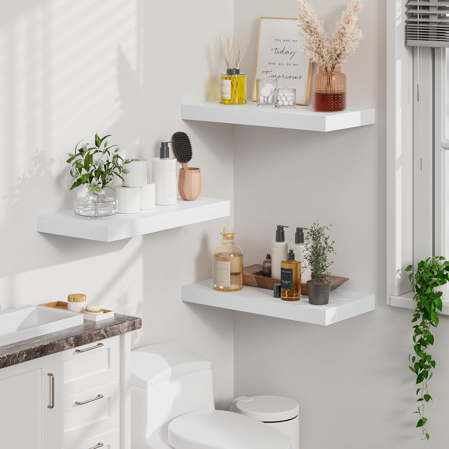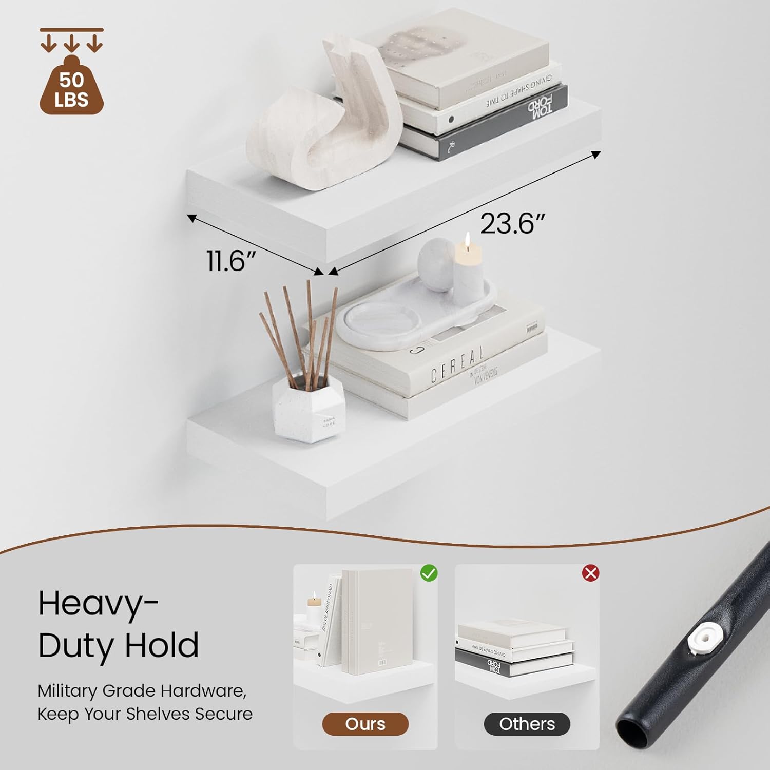 - Extra Deep Floating Shelves: Measuring 11.6β D x 23.6β W x 1.5β H, these shelves are crafted for maximum depth and durability. The spacious 12β depth gives you plenty of room for stylish display, organized storage, and decorative accents. Perfectly suited for your bathroom, kitchen, or living room, they enhance both function and flair in any space!