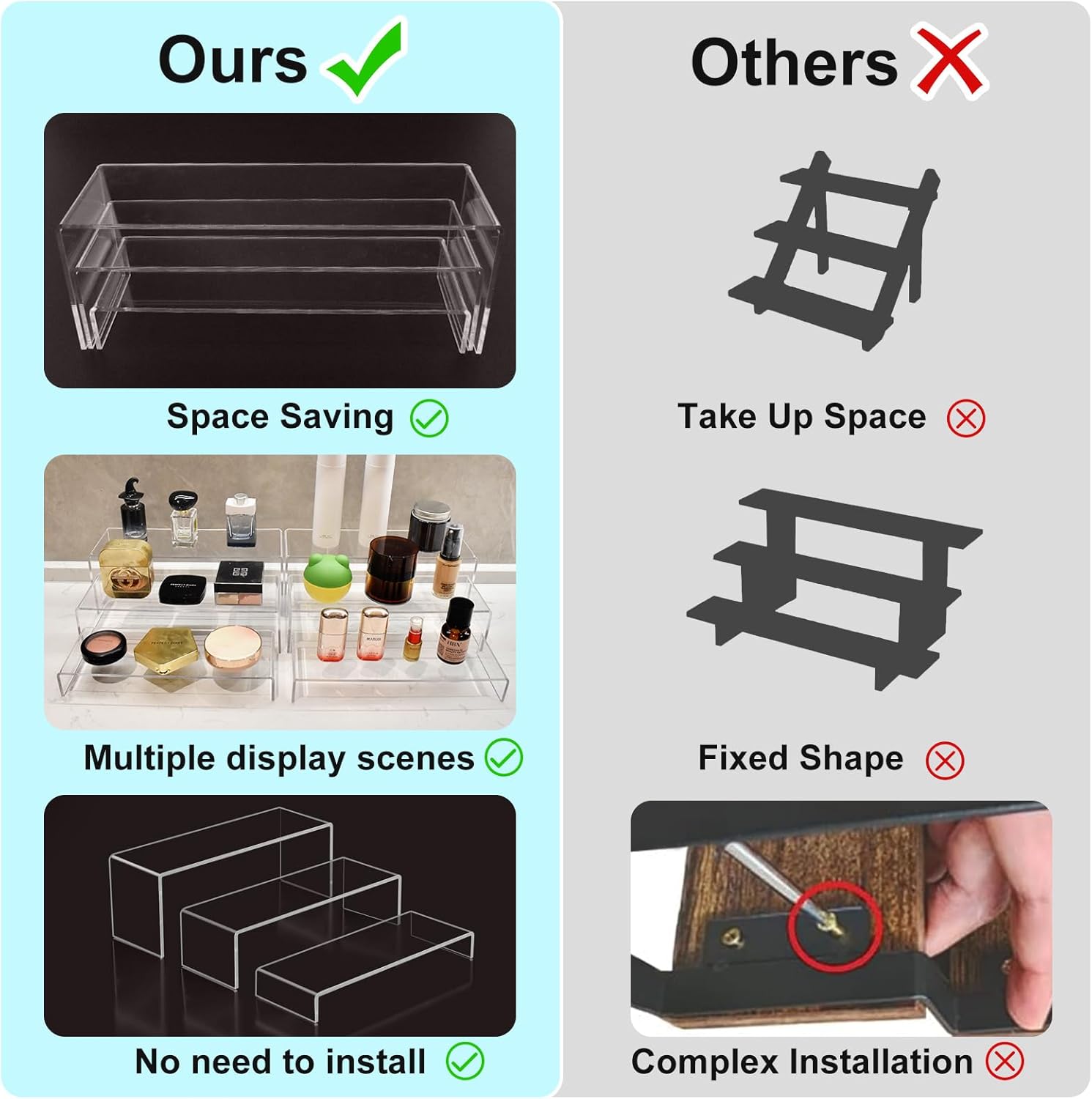 - 【Excellent Visual Presentation】: This clear risers display stands is made of transparent food-grade acrylic, which can clearly show what you want to display, sophisticated and stylish. 3 tier risers display stands provide a floating visual effect for the placed items and properly arrange storage.
