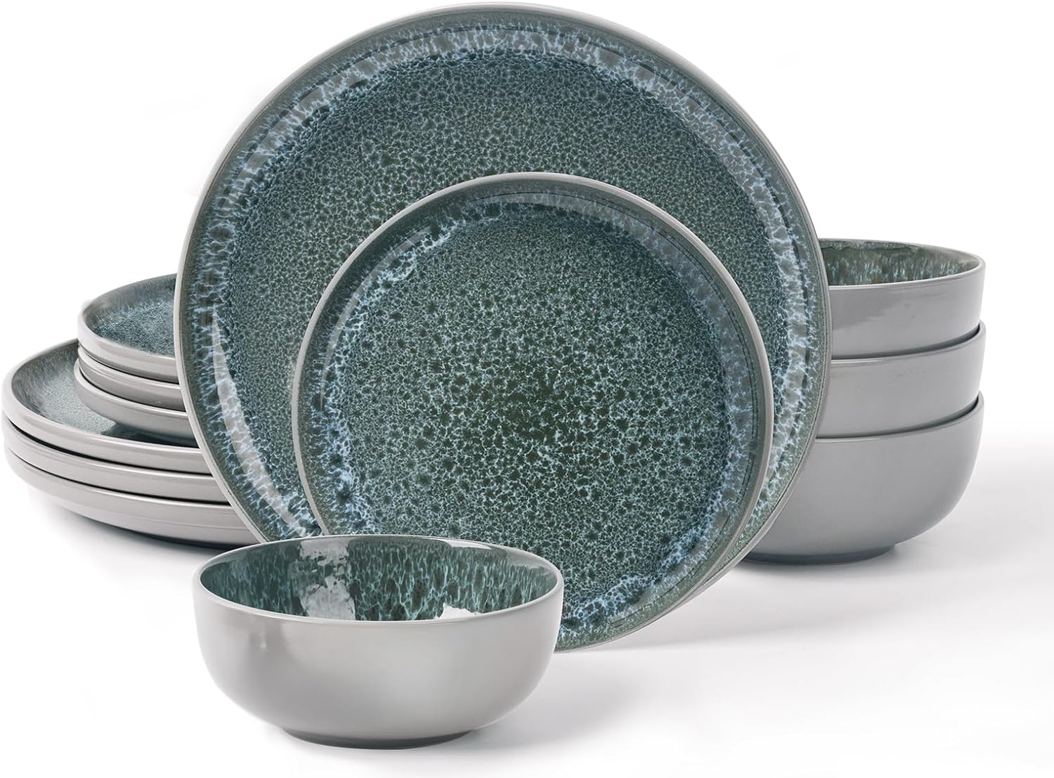 CQN&ZXD Ceramic Plates and Bowls Sets, 12 Pieces, Hand-Crafted Dishes set for 4 with Flowing Reactive-Glaze, Microwave & Dishwasher Safe Dinnerware Sets, Modern Style, Elegant Grey & Wave Blue