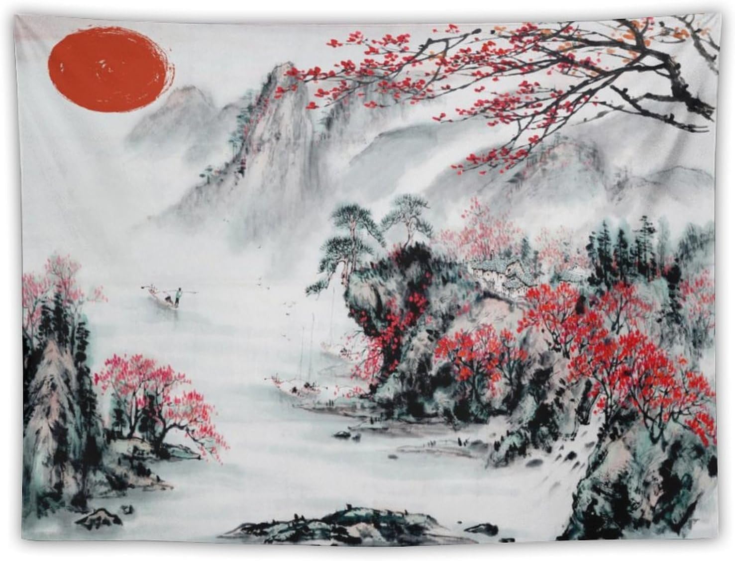 Cherry Blossoms Tapestry,Japanese Red Landscape Asian Watercolor Abstract Art Tapestry, Asian Japanese Wall Tapestry, Nature Landscape Tapestries for Bedroom Living Room Decor 80"x60"