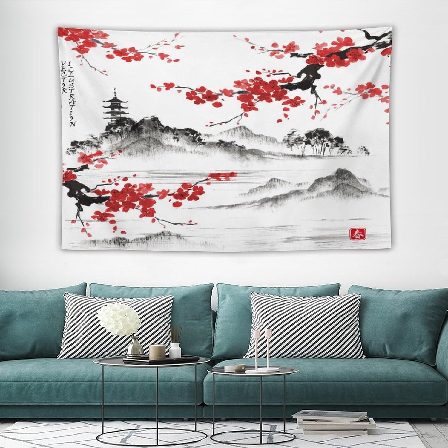 Cherry Blossoms Tapestry, Japanese Fuji Mountain Tapestry, Asian Japanese Wall Tapestry, Nature Landscape Tapestries for Bedroom Living Room Decor 90"x60"