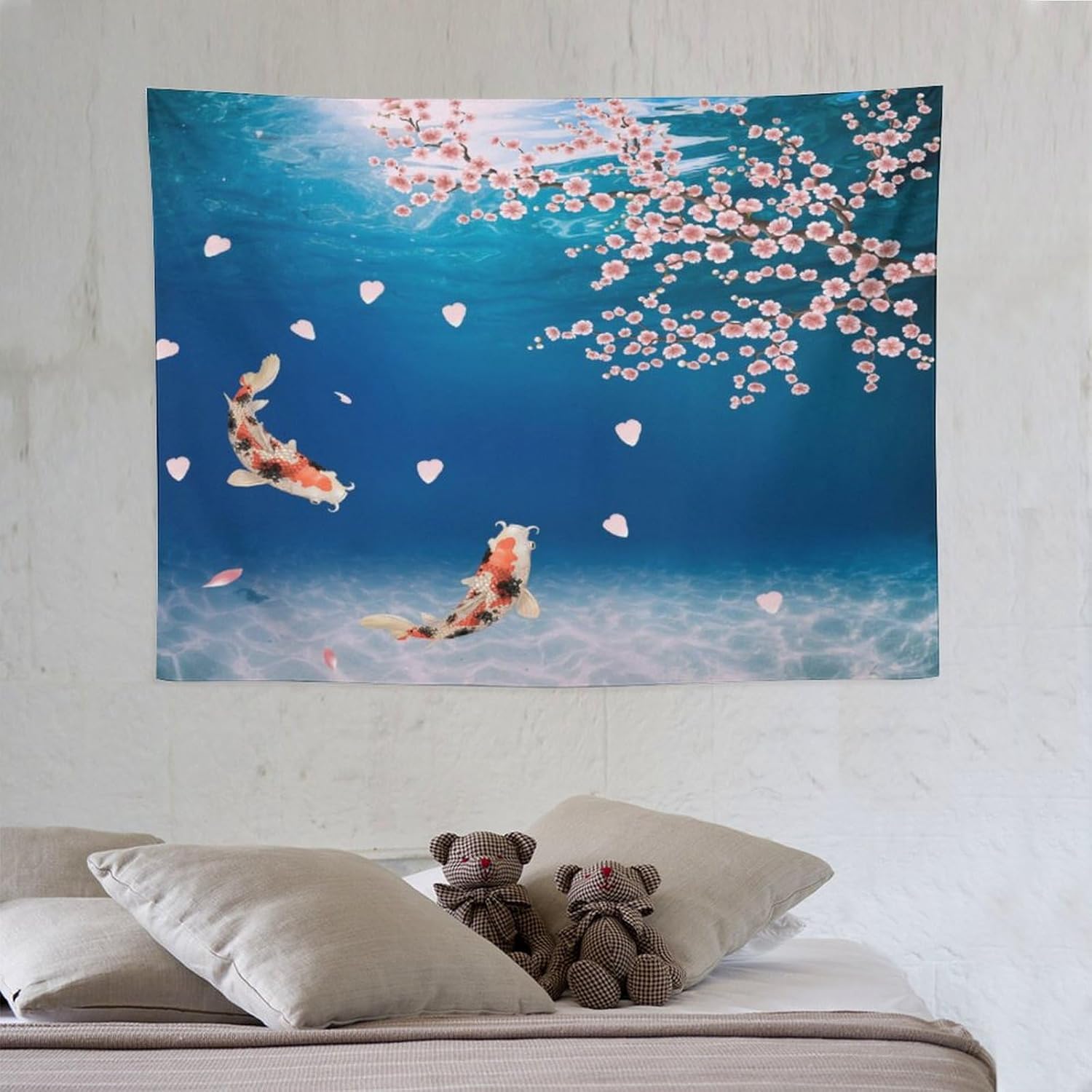 Japanese Koi Fish Tapestry, Cherry Blossoms Asian Oriental Blue Floral Branch Koi Fish Carp Tapestries Wall Hanging for Bedroom Living Room Office Decor 40"x30"