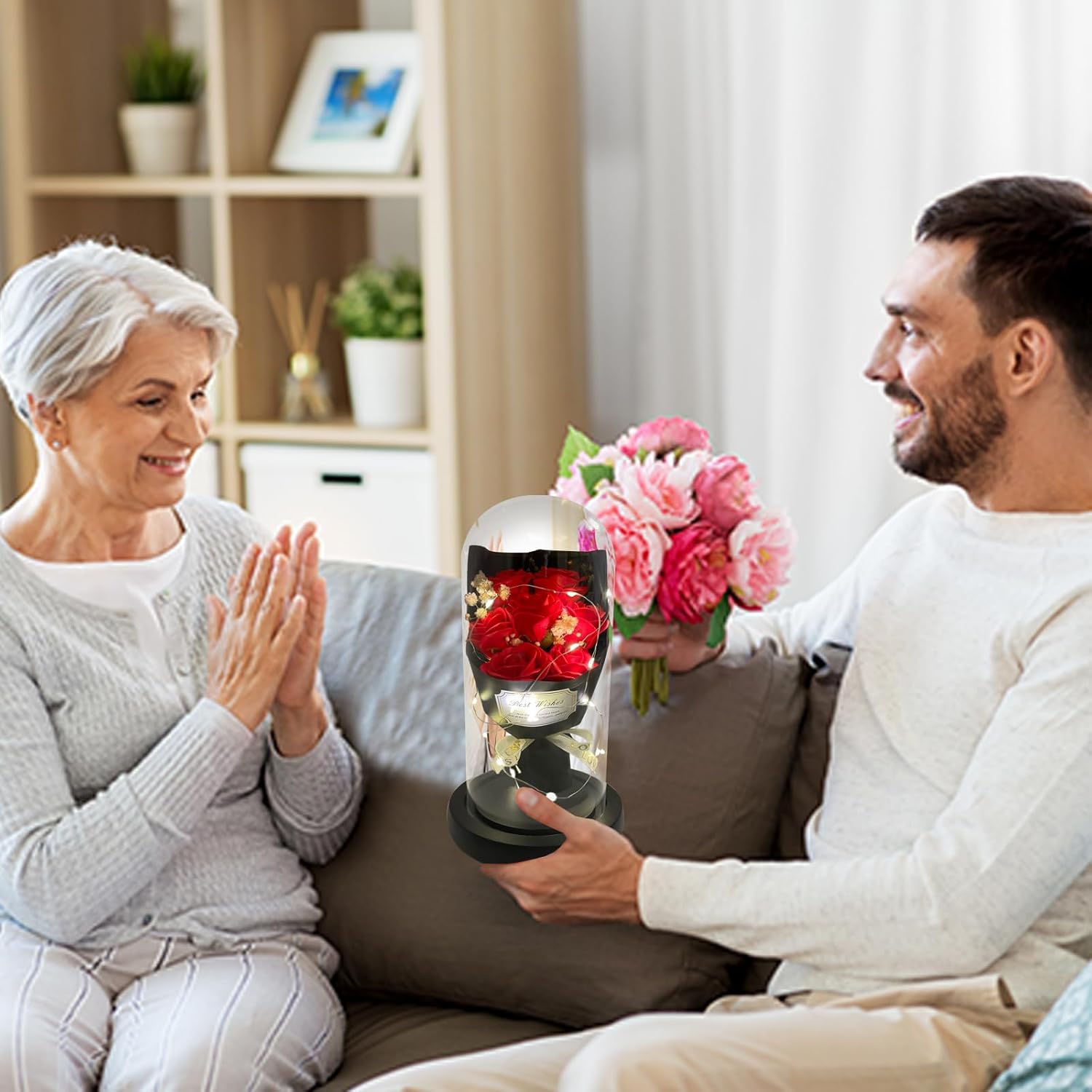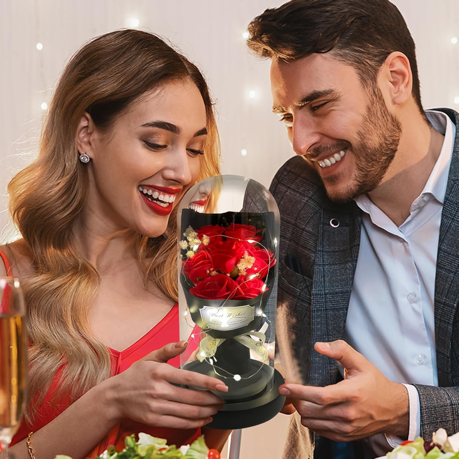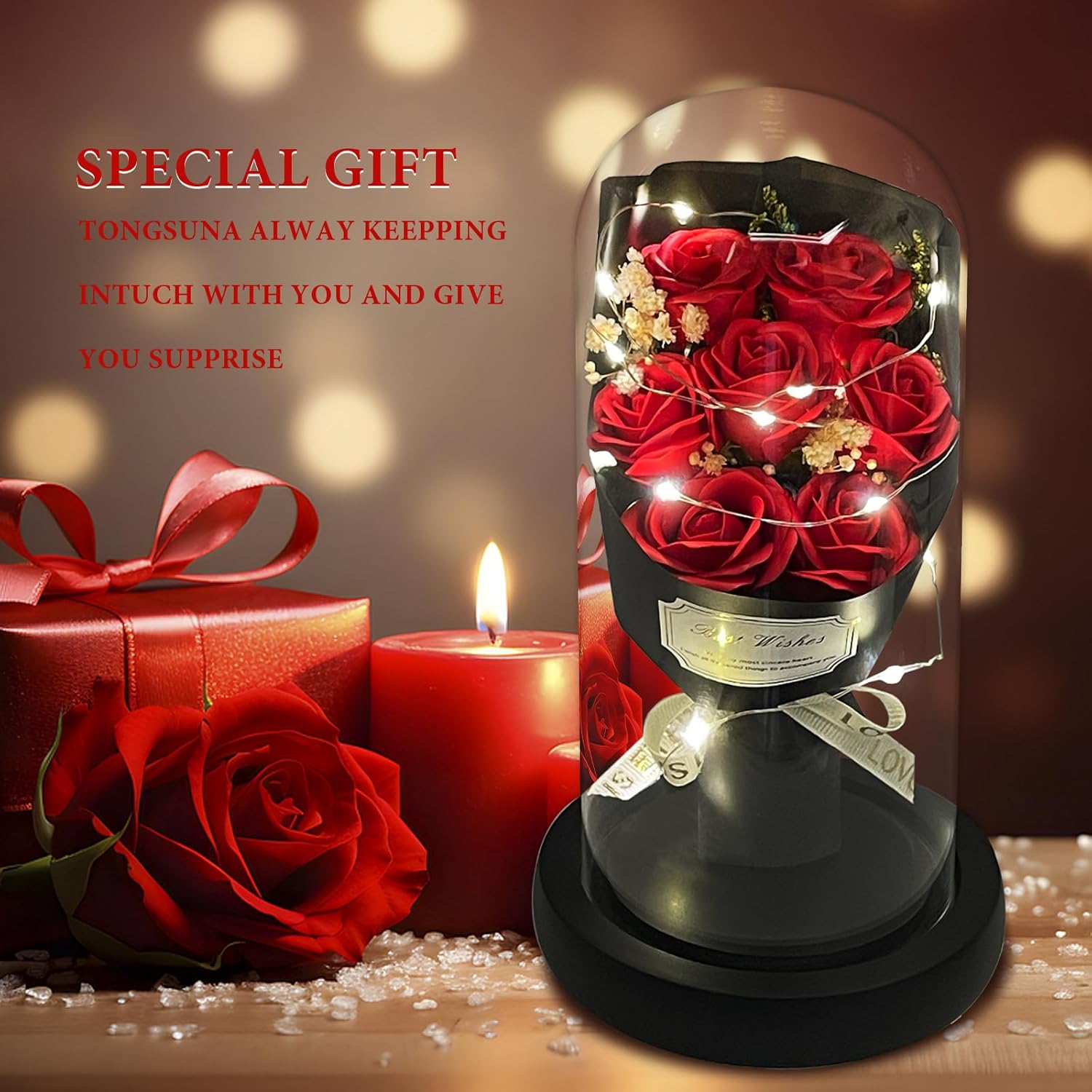 - 【Valentines Flowers Gifts Come With Happiness】:Women Gifts from daughter son. Valentines gifts for her. The twinkle lights wrapped around the flower rose bouquet in glass dome. Everyone will fascinate it when it light at romantic nigth. Get it on the special day, get happiness and sweet time.