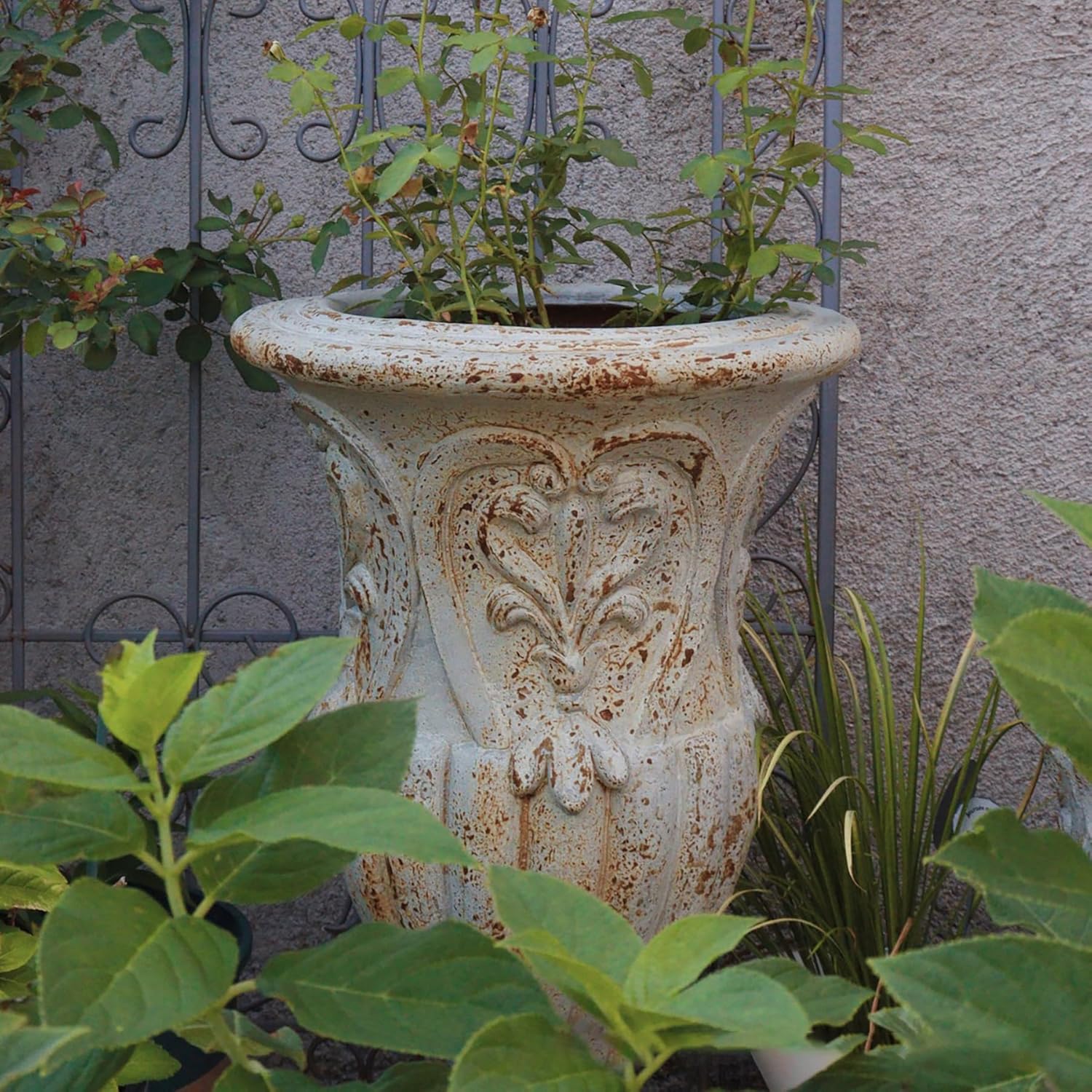 - CLASSIC DESIGN: Elegant European-style urn planter featuring intricate floral patterns and a weathered white finish for timeless garden appeal