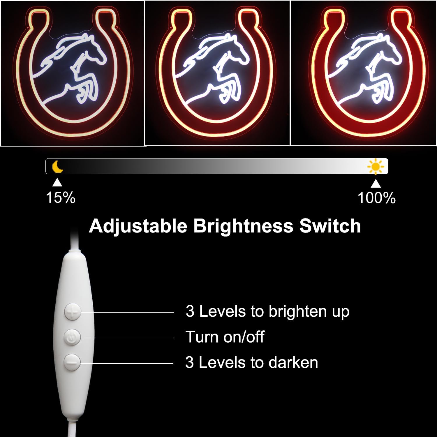 - With Dimmable Switch - White horse neon sign for wall comes equipped with a dimmer switch, allowing for various lighting preferences. Whether hosting a Derby-themed party or creating a cozy barn-inspired ambiance, this equestrian neon wall light can satisfy you.