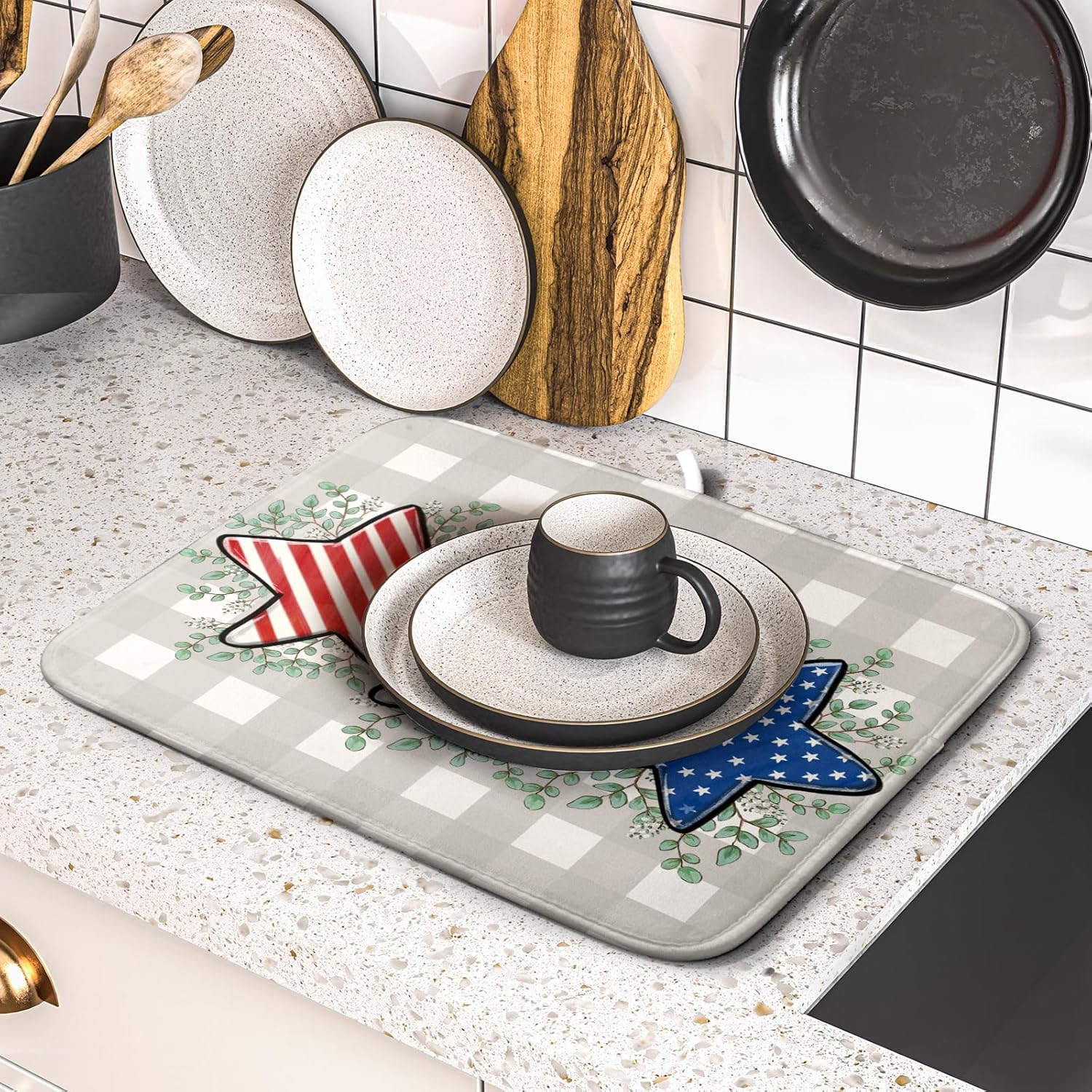 - 【Absorbent】The 4th of July dish drying mat is a 3-ply design made of absorbent microfiber, composite sponge, and cotton sateen fabric, the dish drying pad absorbs 4X its weight in water. Perfect for air-drying dishes, glasses, pots, pans, bottles, fruits, and vegetables