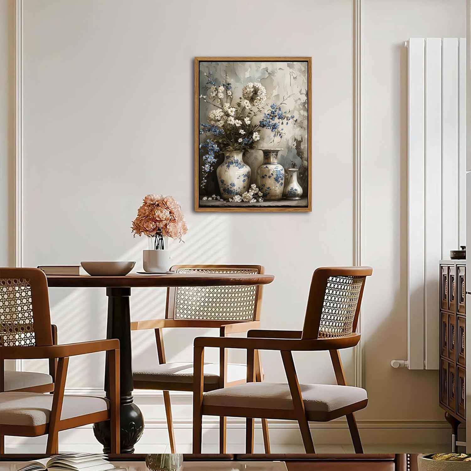 Floating Framed Farmhouse Floral Canvas Wall Art, Vintage Blue and White Flower Pictures Wall Decor, Elegant Art Jar Posters Print for Living Room Bedroom Bathroom Rustic Decor 16x24 inch