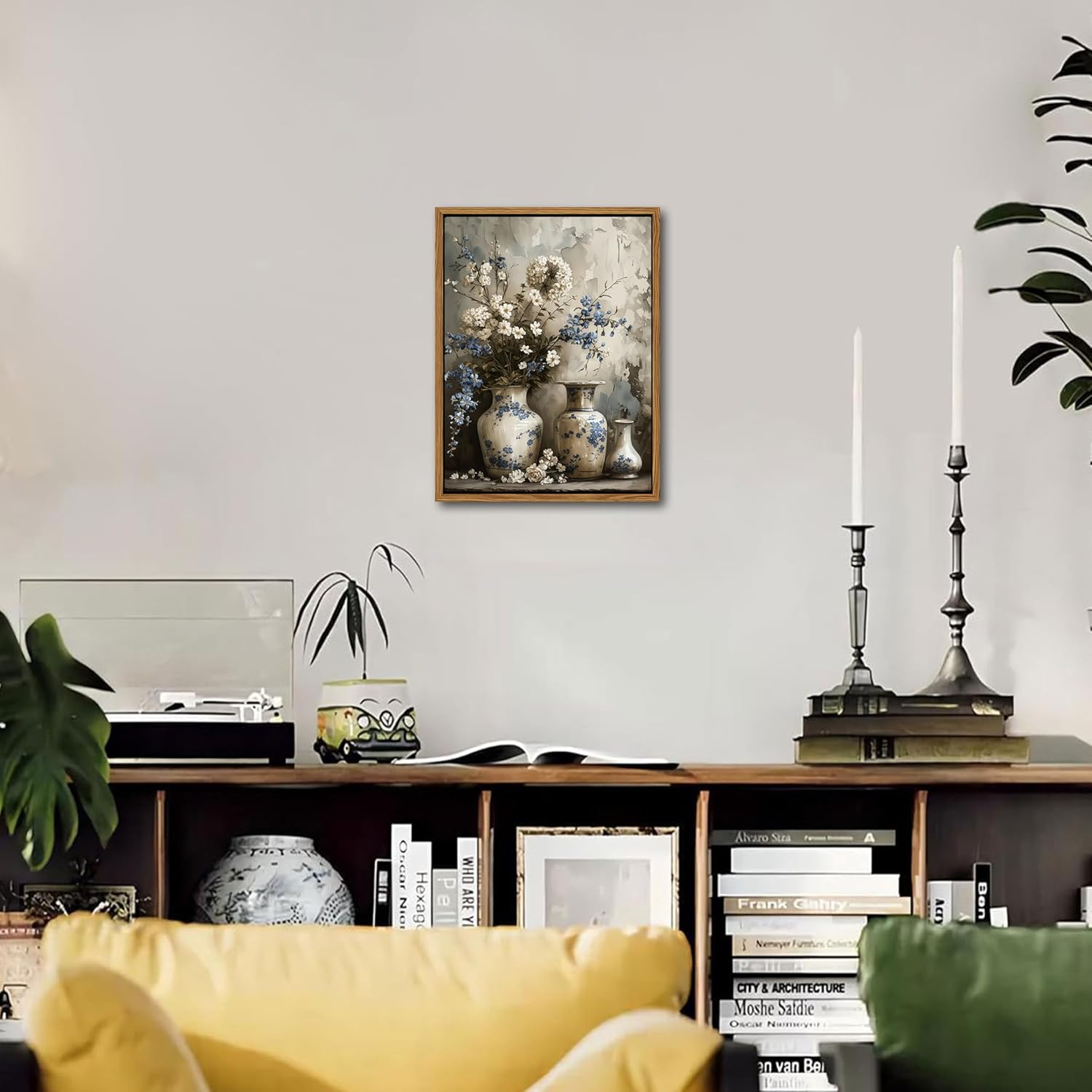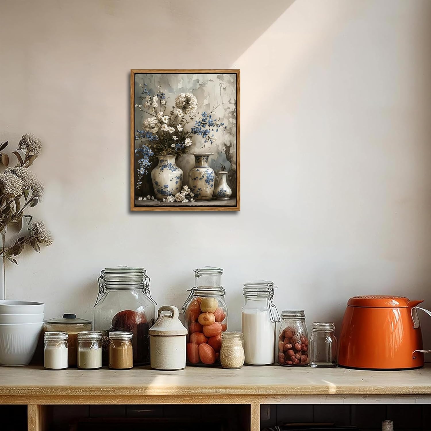 - Framed Canvas Wall Art: This vintage farmhouse floral canvas features elegant blue and white flowers in a charming art jar, capturing a timeless rustic beauty. It’s the perfect accent to enhance your living room, bedroom, bathroom, or any cozy home corner.