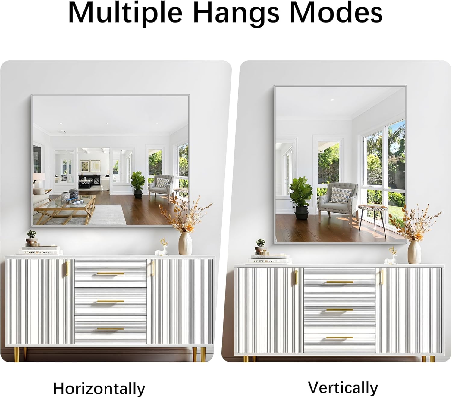 Silver Bathroom Mirror for Wall, 30x36 Inch Rectangle with Metal Frame, Modern Vanity for Bathroom Living Room, Entryway Hangs Horizontal or Vertical