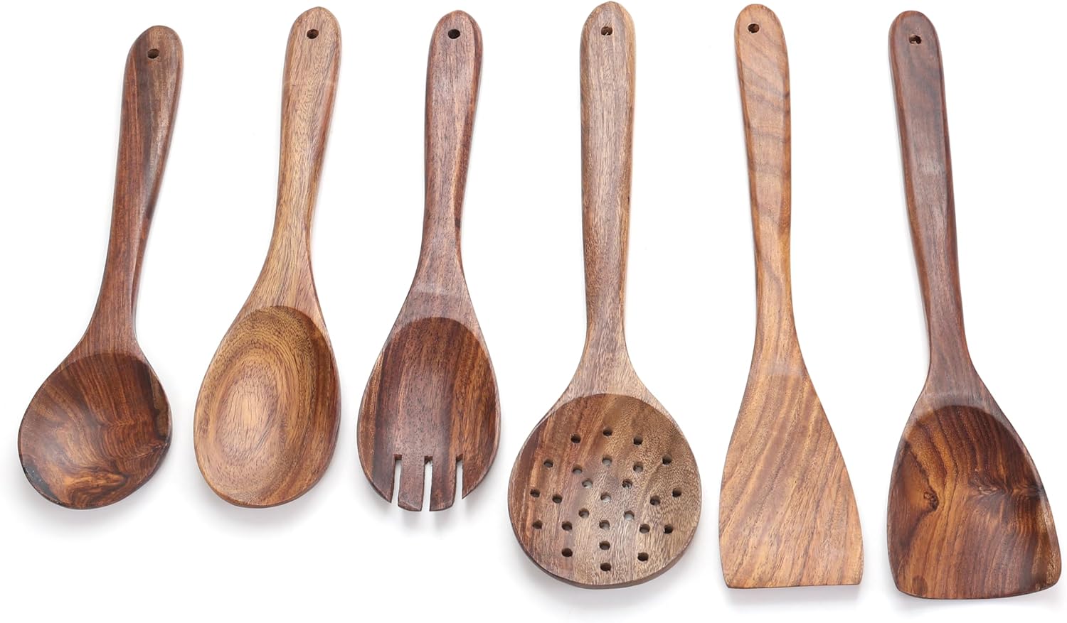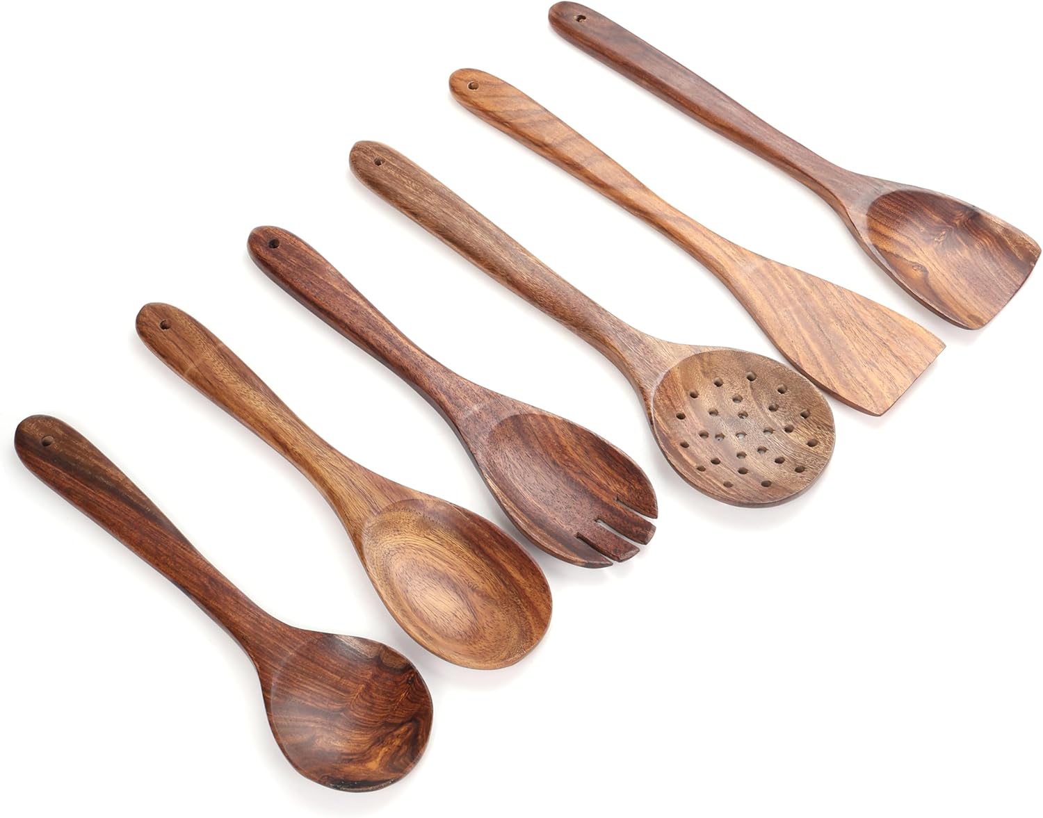 - LIFELONG QUALITY: Woodenhouse kitchen utensils will last a lifetime, they are made of one piece 100% Natural Teak Wood. These tools are beautiful, solid, sturdy, smooth, well designed and have a superb finish. Spoon set will definitely not crack, melt or smell. Utensils may vary in shade because of its natural material.