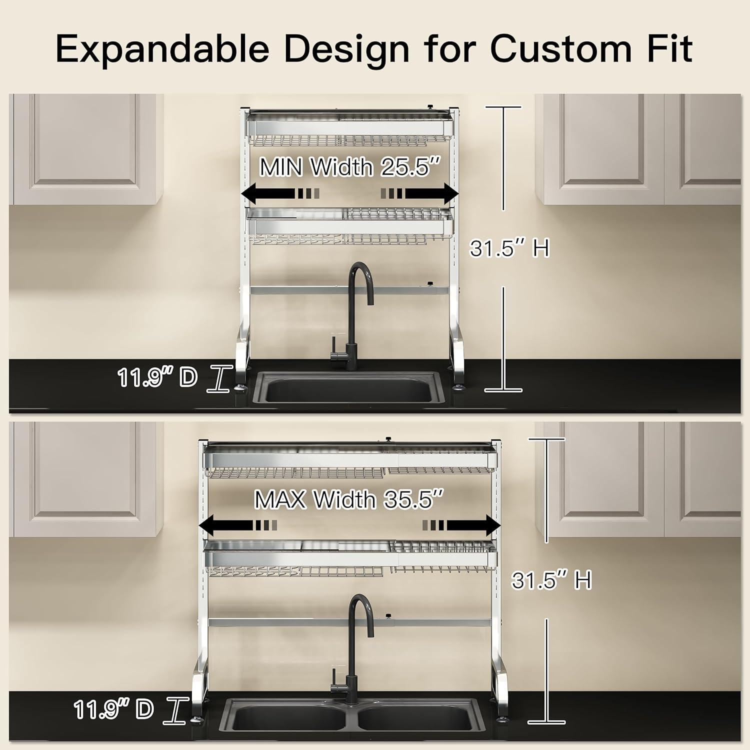 - π Expandable Design for Custom Fit: Adjust the over sink dish drying rack width effortlessly to span most standard single or double sinks, adapting seamlessly to your kitchen layout. The dish drain modular design allows rearranging tiers and accessories to prioritize space for tall glasses, wide pans, or cleaning tools, maximizing vertical storage above the sink
