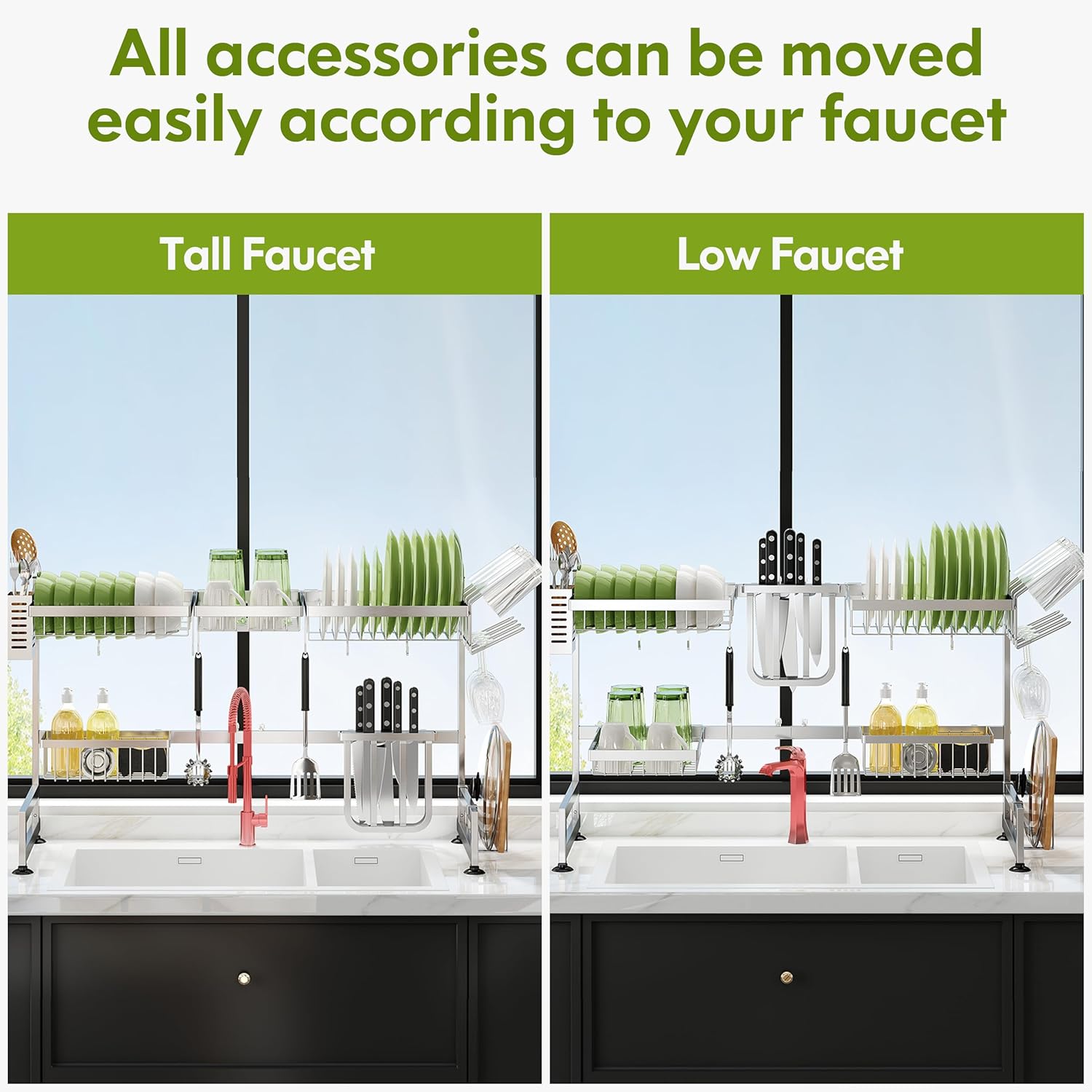 - π Expandable Design for Custom Fit: Adjust the over sink dish drying rack width effortlessly to span most standard single or double sinks, adapting seamlessly to your kitchen layout. The dish drain modular design allows rearranging tiers and accessories to prioritize space for tall glasses, wide pans, or cleaning tools, maximizing vertical storage above the sink