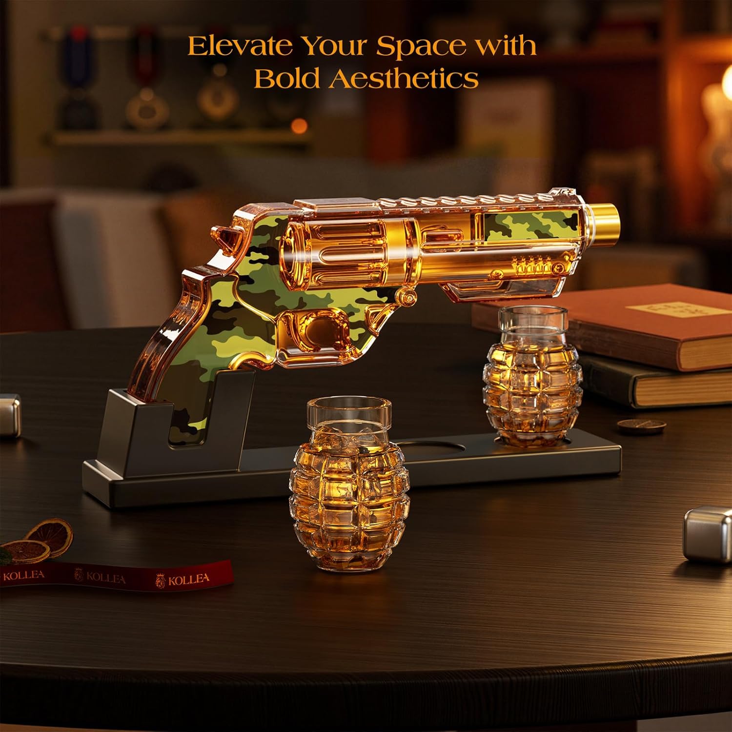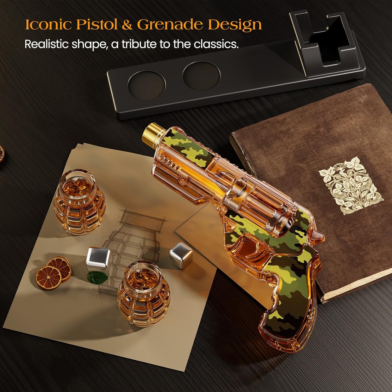 - Bold Design: Features a classic pistol-shaped design with an American flag or camouflage print, paired with two grenade-shaped shot glasses. A collectible display piece that enhances every drinking moment