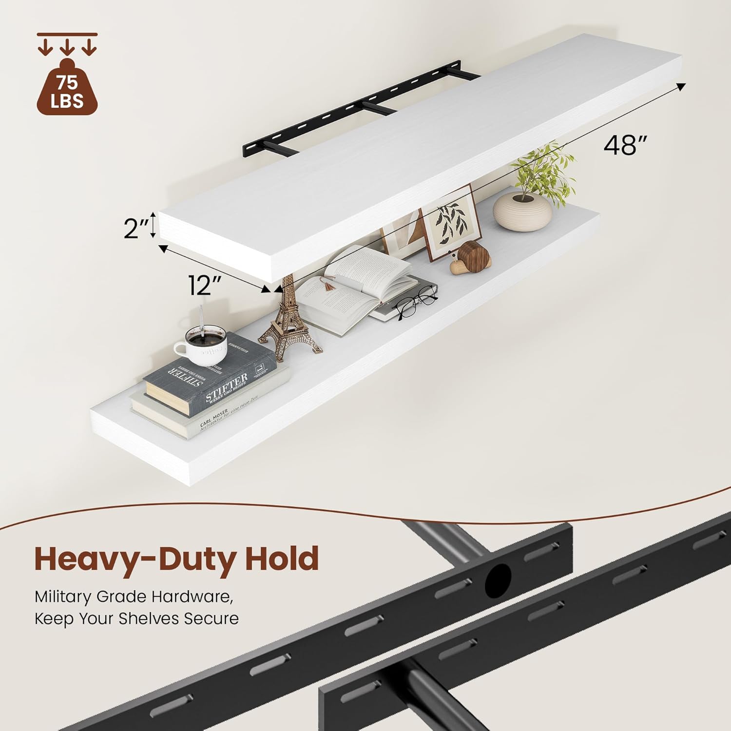 - Sturdy Support - Each wall shelf measures 48"W x 12"D x 2"H. Enhanced Military Grade Hardware brackets hold up to 75 lbs, 2.5° upward angle design ensures long-term stability, preventing tilting or sagging