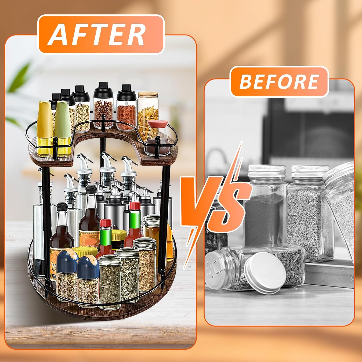 - Solid Wood & Iron Construction: This rotating spice rack is made of vintage solid wood and metal and is very sturdy and durable. Unlike ordinary wood, it has a special coating that makes it waterproof and heat-resistant, so it can be finish prevents stains from oils/vinegars