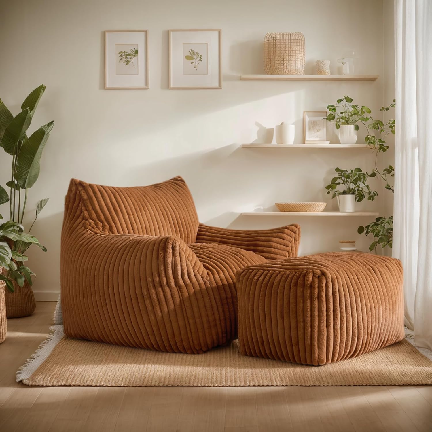 Giant Bean Bag Chairs for Adults, Oversized Chaise Lounge Chair Indoor with Memory Foam - Plush Boneless Lounger & Ottoman for Bedroom, Living Room, Gaming & Reading, Lazy Floor Sofa Chair, Orange