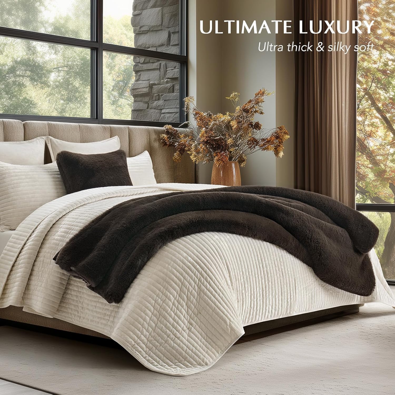 - EXTRA PLUSH & COZY GOODNESS - Indulge in the cloud-like comfort of our Ultimate Faux Fur Blanket, wrapping you in serene softness for the ultimate snuggle experience. Crafted with luxurious 1000GSM ultra-plush faux rabbit fur on the topside and backed with 220GSM buttery velvet fabric. The remarkable thickness and weight ensure a secure feel, making you enjoy a deep sleep and keeping you warm on the coldest days.