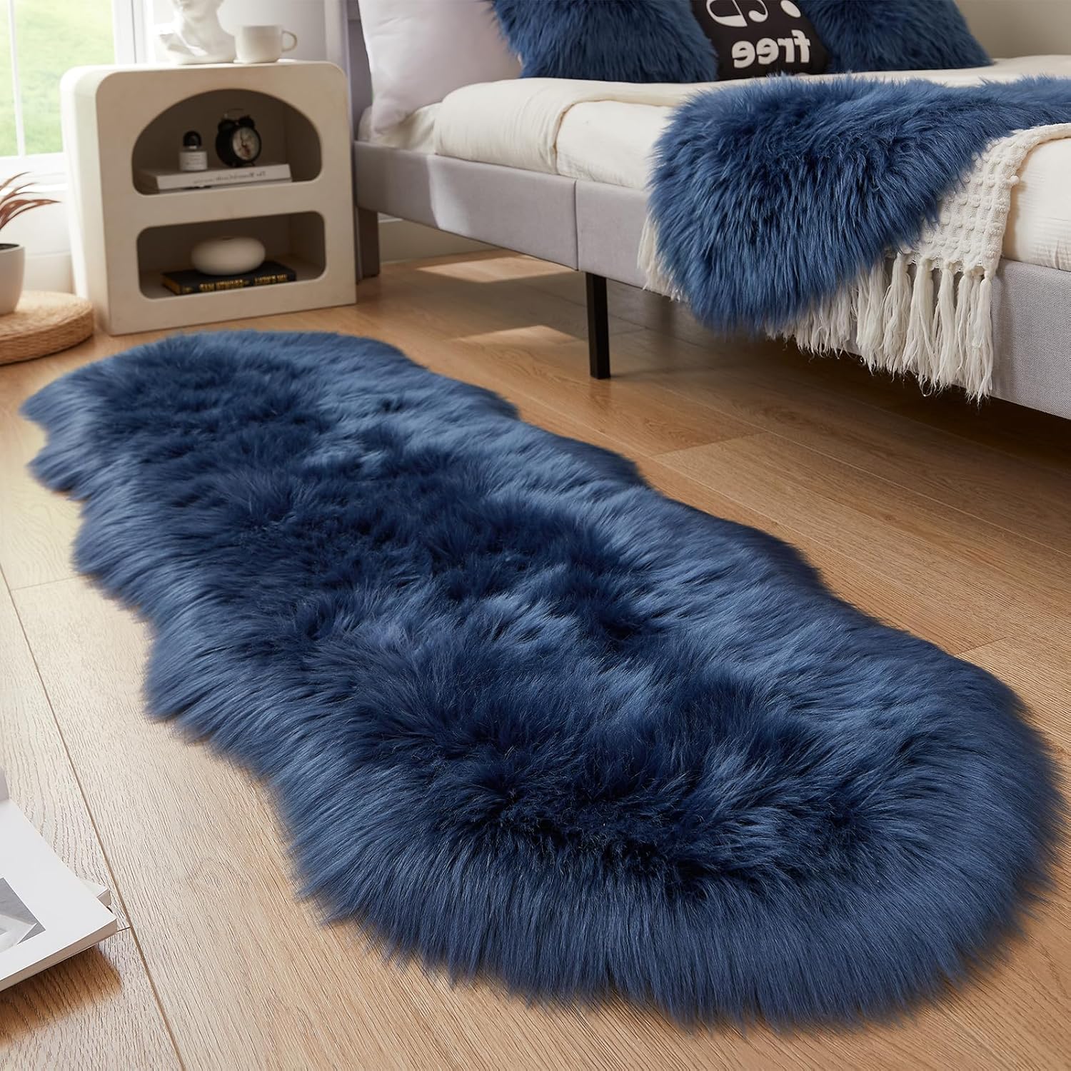 AMTOVO Faux Sheepskin Rug, Dark Blue Ultra Soft Fluffy Shag Area Rug, 2 x 6 ft Faux Fur Rug for Bedroom Sofa Throw Cushion Room Decor, Sheepskin