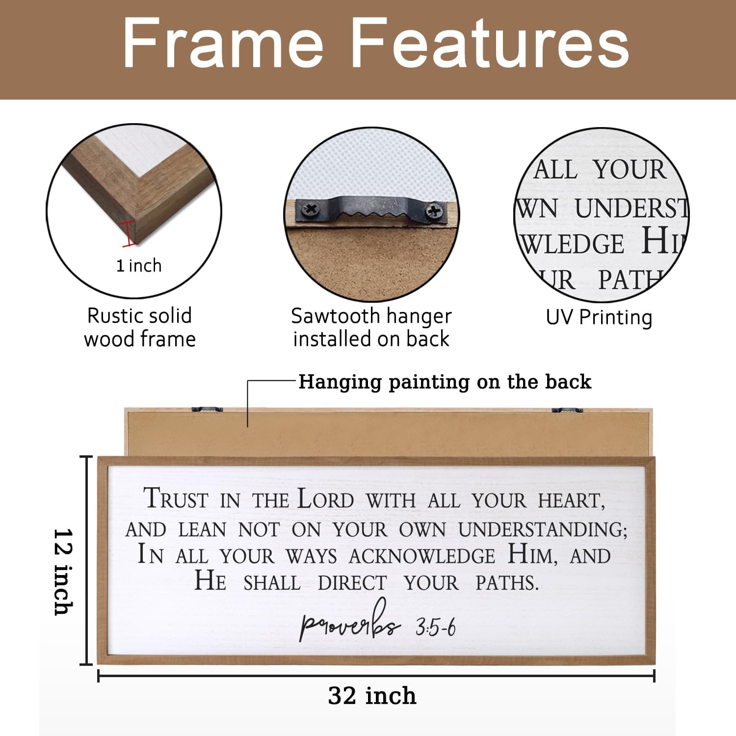 Trust in the Lord With All Thine Heart Wall Decor Art Bible Verse Sign Proverbs 3:5-6 Framed Wood 32X12 Inch For Scripture Christian Hanging (Wood)