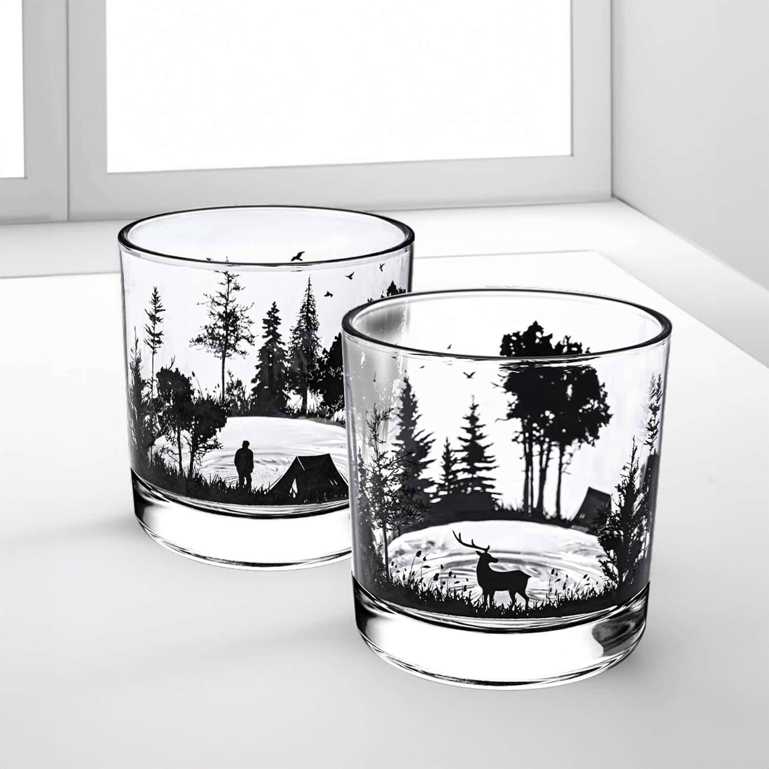 - 🔸 6 Unique Nature-Inspired Designs Each glass features a handcrafted black silhouette of outdoor scenes: forest camping, lakeside fishing, stargazing on a car roof, and more—perfect for nature lovers and storytellers.