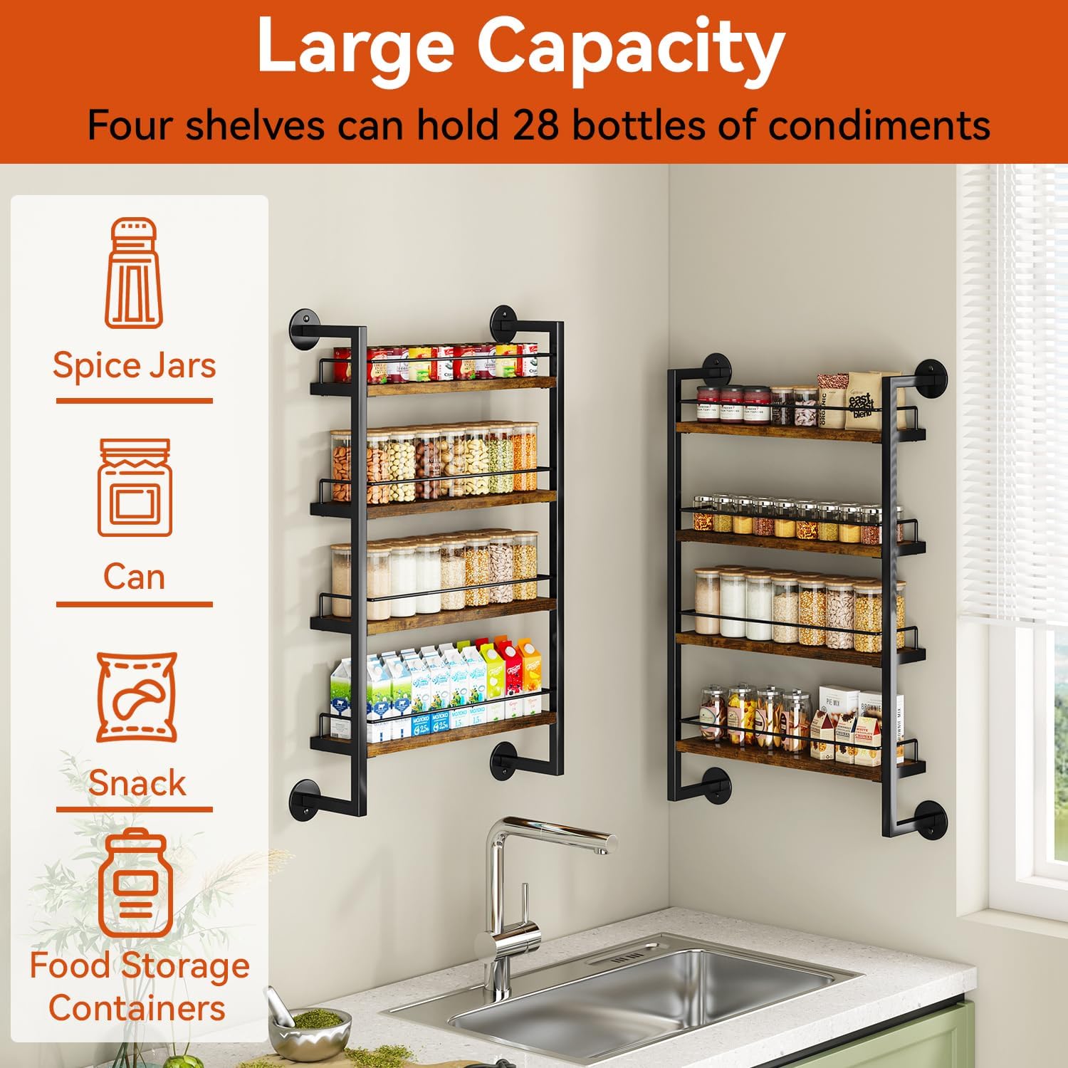 IBUYKE Spice Rack Wall Mount,4 Tier Hanging Seasoning Organizer,Large Spice Rack for Wall for up to 50 Jars,Spice Organization for Kitchen Cabinet,Bathroom,Pantry,Living Room,Brown TLJ016H