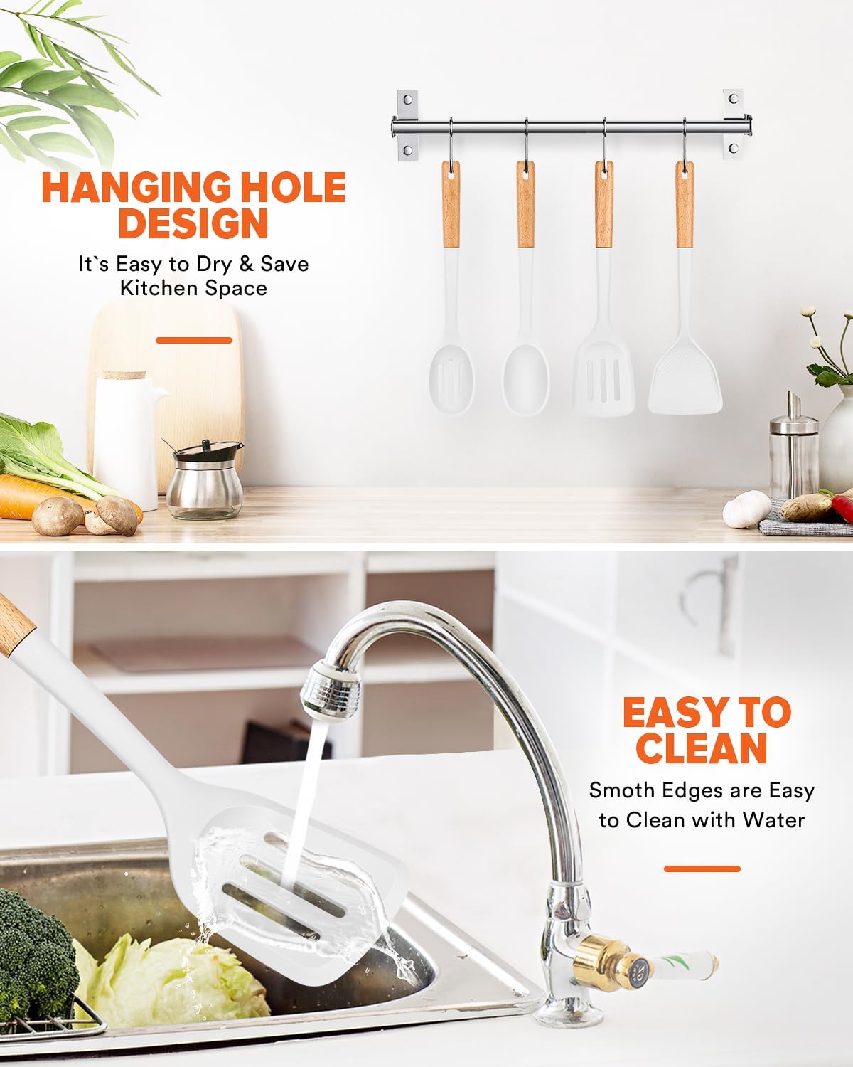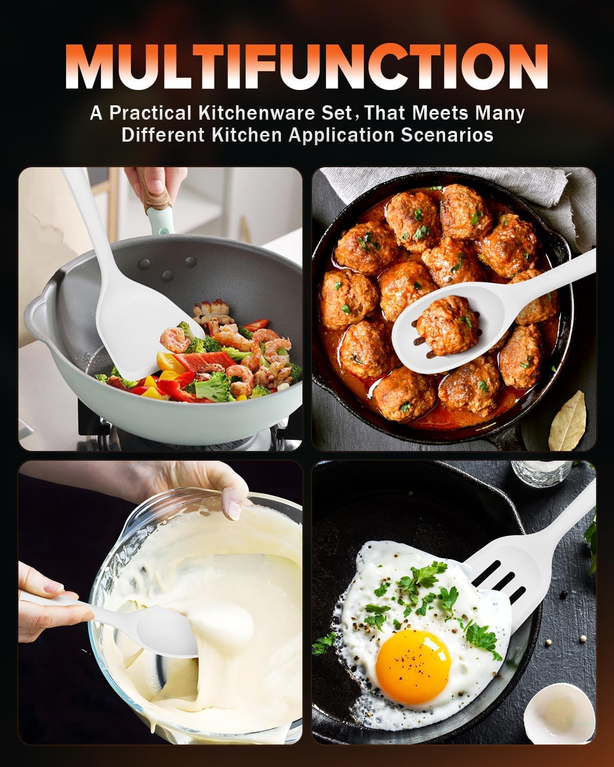Silicone Cooking Utensils Set, Perfectly Angled for Frying, Mixing,Serving,Draining,Turning and Stirring, BPA-Free Matte Silicone, Wood Handles, Safe for Nonstick Cooking Surfaces,4 Pack (White)